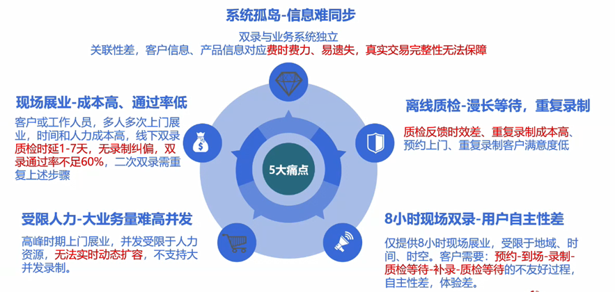 仅提供8小时现场展业,受限于地域、时间、时空。客户需要:预约-到场-录制-质检等待补录质检等待的不友好过程,自主性差,体验差。