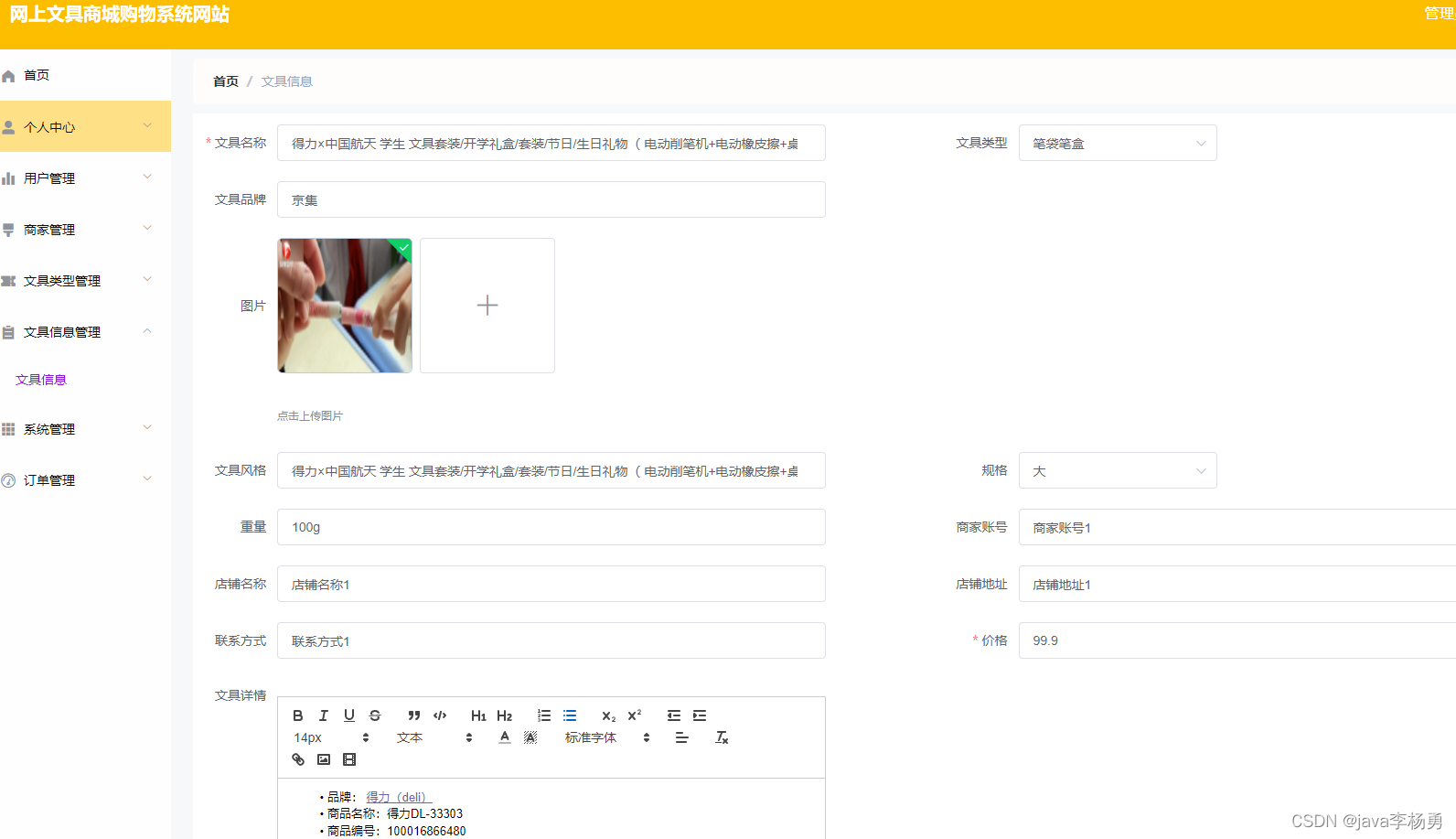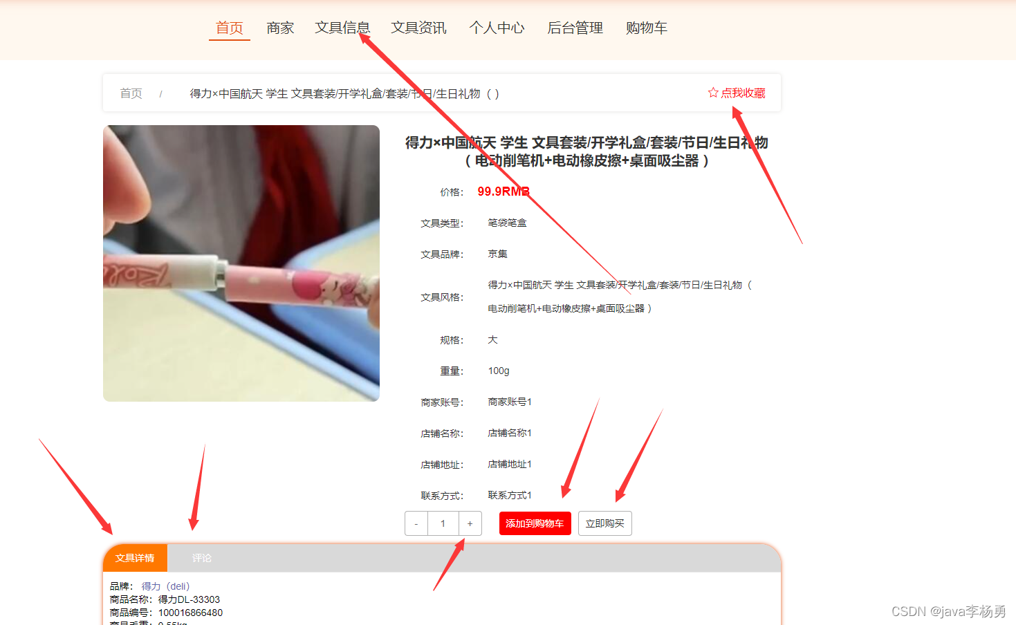文具商品: 用户在文具详情界面可查看文具详情