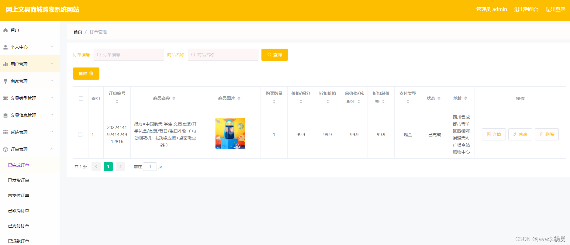 订单信息: 管理员可进行订单管理操作,可查看所有订单信息,并可对其订单进行发货和删除操作,订单管理界面展示如图所示。