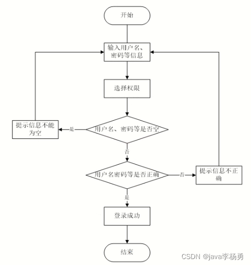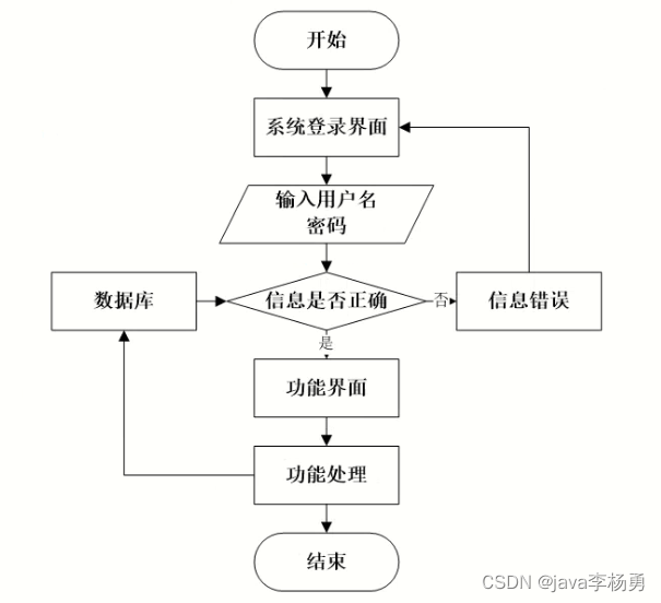 用户打开并进入系统后,会先显示登录界面,输入正确的用户名和密码,系统自动检测信息,若信息无误,则用户会进入系统功能界面,进行操作,否则会提示错误无法登录,操作流程如图3-3所示。