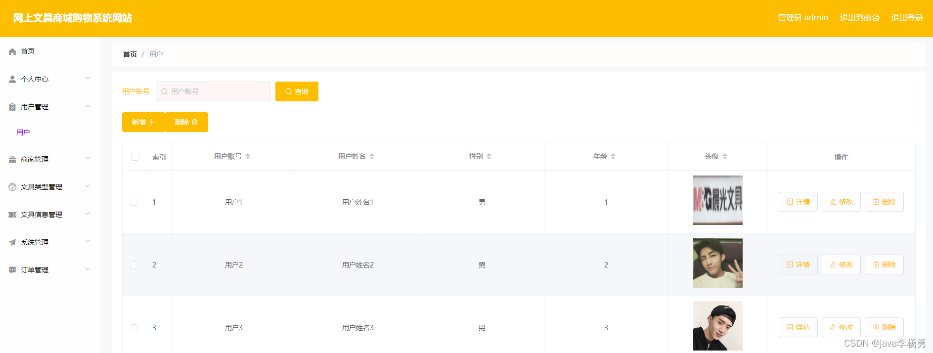 用户管理: 管理员可查看所有会员信息,并可修改会员资料以及删除操作,会员管理界面展示如图所示