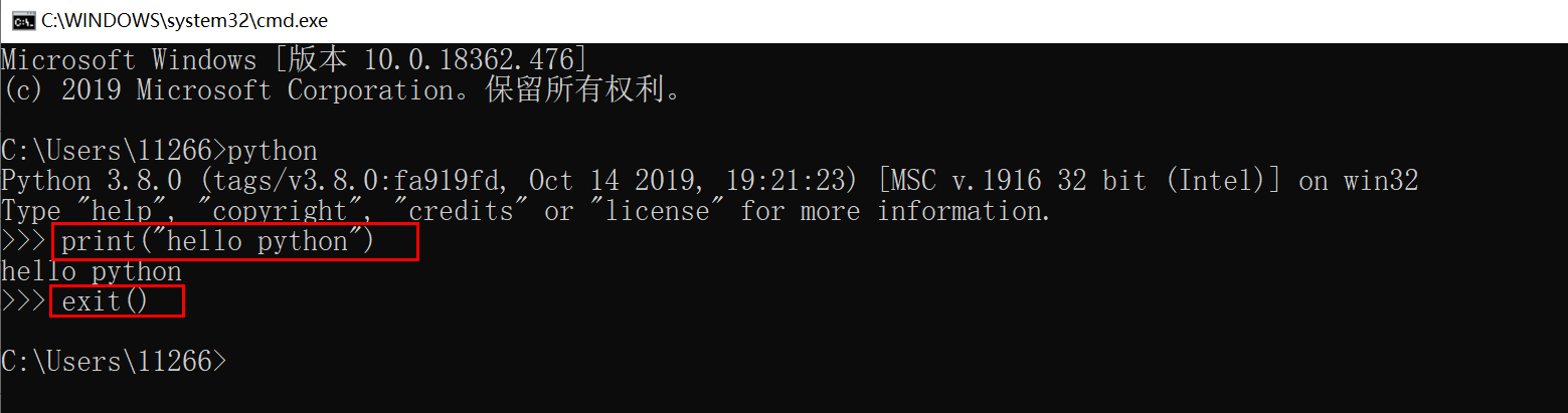 | C:\Users\11266>python Python 3.8.0 (tags/v3.8.0:fa919fd, Oct 14 2019, 19:21:23) [MSC v.1916 32 bit (Intel)] on win32 Type "help", "copyright", "credits" or "license" for more information. >>> 100+500 #直接输入有效数字进行运算 600 >>> 300-100 200 >>> print("hello python") #打印文本 hello python >>> print('hello python') #打印文本 hello python >>> exit() #退出交互式命令行 C:\Users\11266> |