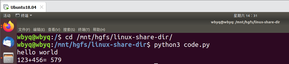 | wbyq@wbyq:/$ cd /mnt/hgfs/linux-share-dir/ wbyq@wbyq:/mnt/hgfs/linux-share-dir$ python3 code.py hello world 123+456= 579 |