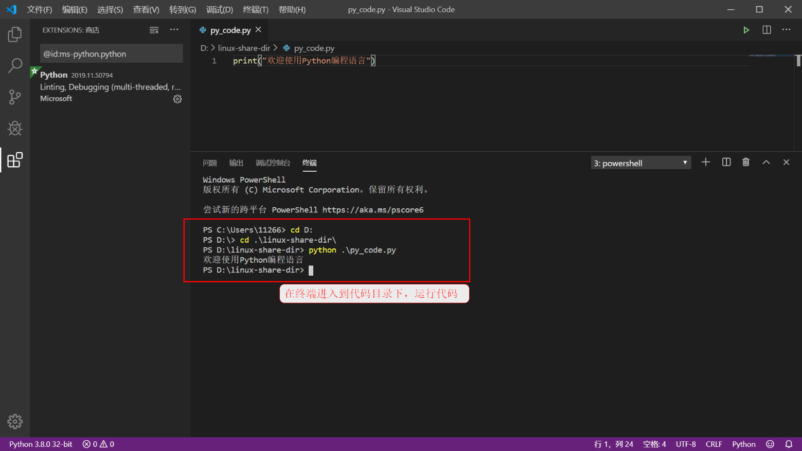 进入到code.py文件存放的目录下,使用python解释器运行code.py文件。
