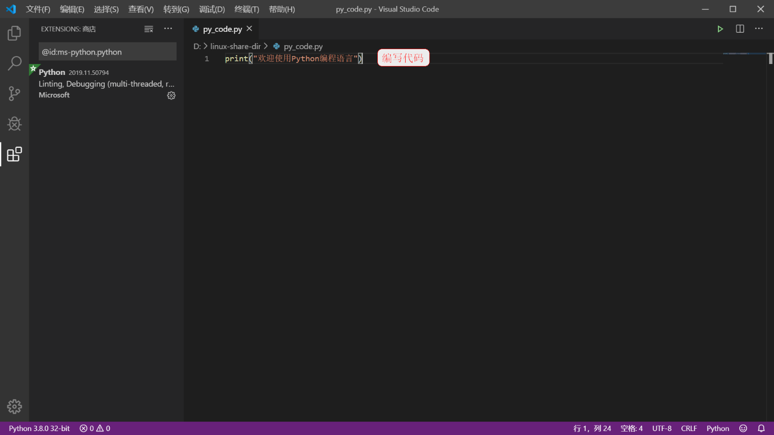 示例: 将以下代码写到文本编辑器中,然后保存为code.py