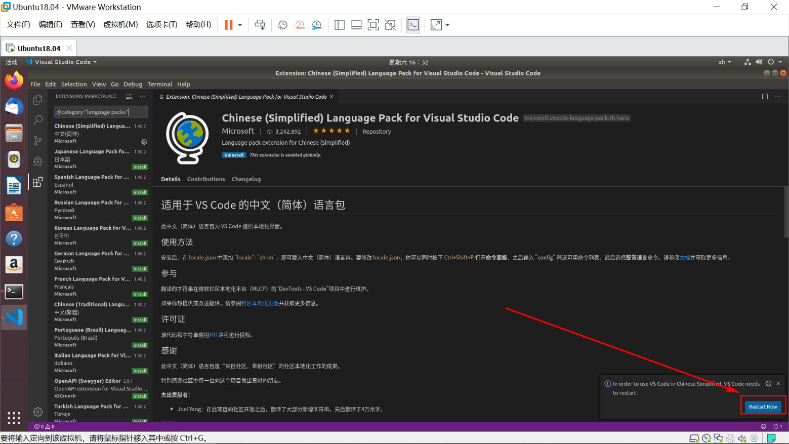 安装之后右下角有提示重启,点击重启即可。