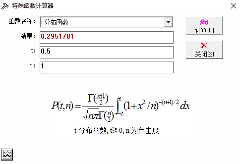 以下是一种特殊函数计算器的界面,该软件运行在Windows操作系统,具有上述特殊函数的计算功能。从下拉框中可以选择特殊函数的种类,输入特殊函数对应的参数后,点击“计算”按钮后输出计算结果,用红色数字显示。在界面下面部分有特殊函数对应的公式,说明输入参数的意义及限制。