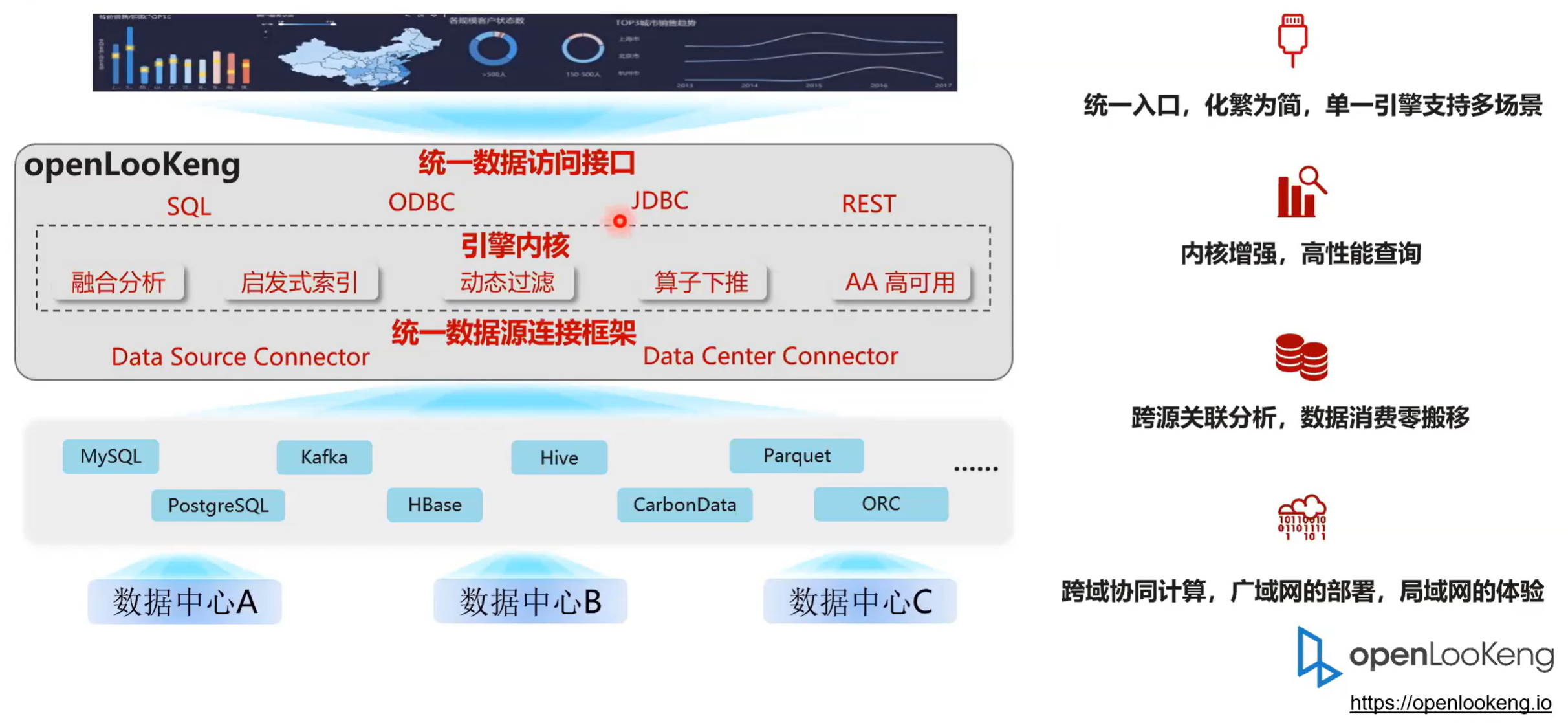 第三部分就是数据源层,openLooKeng提供了一个抽象的数据源框架 data connect framework ,这样的话针对的不同的数据源,我们只要复写它提供的一些接口,就可以简单高效的把数据源接入到 openLooKeng引擎里面来。当前 openLooKeng支持的数据源应该有二十种,然后重新开发一种数据源也是非常简单的。同时我们也实现了一个跨 DC 的 connect 也就是说我们通过openLooKeng的 DC connect 可以去访问另一个openLooKeng集群,这样的话我们形成一个跨域的级联的分析。总体整体来说就是说 openLooKeng有四个特点。第一个就是同一路口化环为点,单一引擎支持多场景。然后第二部分就是内核增强,高性能查询。第三部分就是跨源关联分析,数据消费零搬迁。