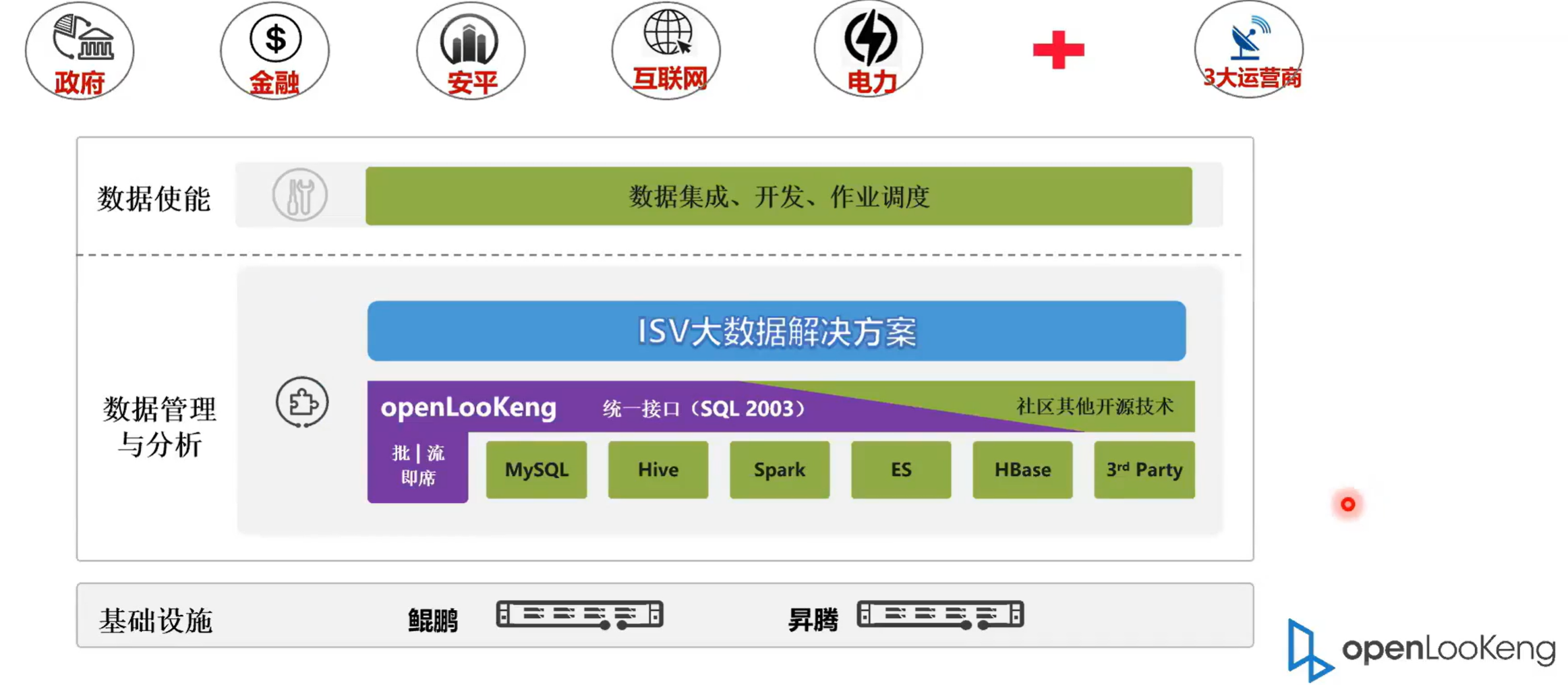 我们接下来看一下就是openLooKeng在大数据一个整体的解决方案中的一个位置。我们可以看到就是openLooKeng属于一个在引擎层的位置,它属于数据查询的一个组件。但是相比于 Spark Hive 参数来看的话,它处于一个更高的层次,因为它下层可以接的数据源就包括了 MySQL hive, hbase 等。而底层的硬件设备是可以支持 Kunpeng和X86 都是可以的。然后上层openLooKeng的上层就是 ISV 的大数据解决方案,这个大数据解决方案可以是数据中台等的解决方案。再上层就是我们的数据使能层。数据使能层就包括数据开发的工具、调度工具,然后再上层就是我们的应用。比如说我们典型的五大应用,政府、金融、安频、互联网、电力加三大运营商。