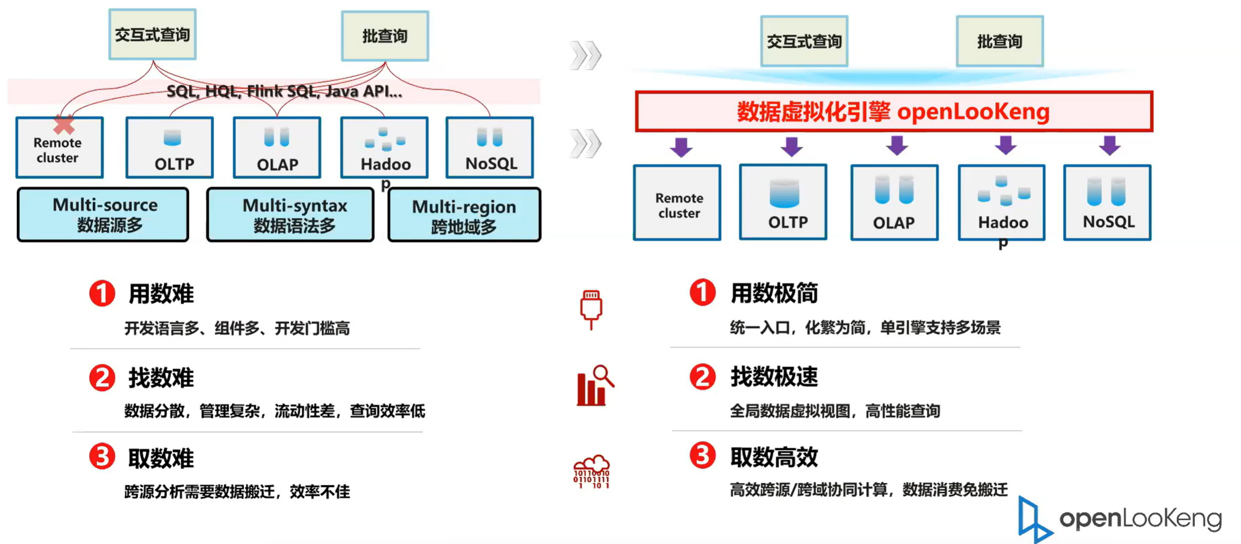 首先我们在介绍 openLooKeng之前,我们大致的介绍一下当前大数据面临的一些困难。然后主要是困难就是包括左边的三个方面。第一个就是我们看到的我现在一个很典型的场景,就是很典型的问题,就带大数据的。在大数据中心里面,我们都会有很多的引擎,比如说有OLTP的、 OLAP 的,同时有 hadoop 还有 noSQL 的,然后不同的引擎又有不同的语法。然后通常我们还要面临的是跨地域的一个访问。所以说总结起来就有三个部分的困难。一个就是用数难,对于我们面临的开发的组件越多,老开发语言越多,这样的话导致的开发成本越高。但是说我们要从不同的数据语言中,如果进行关联分析的话,我们需要掌握的语言会很多。