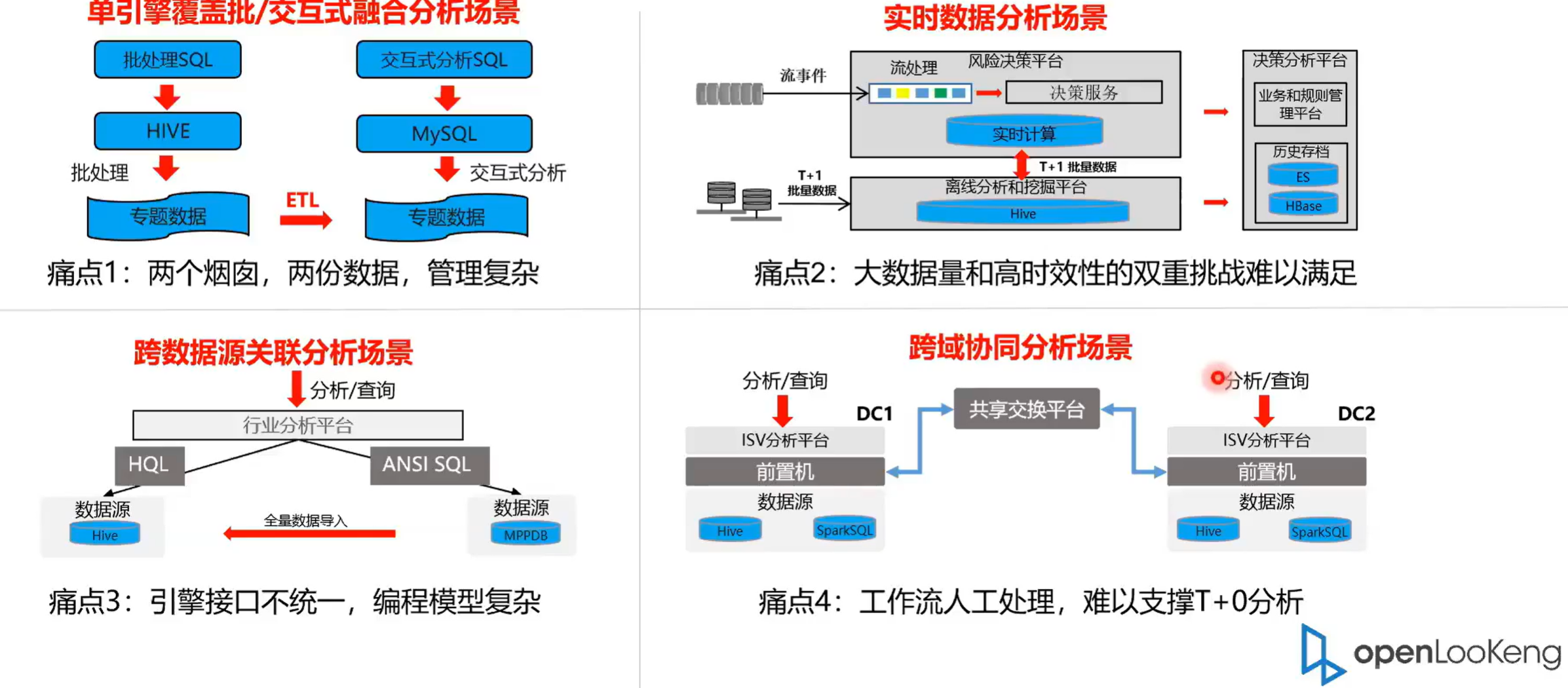 openLooKeng面临的四大场景,也就是openLooKeng跟主要发力的四大场景。第一个就是单引擎覆盖交互式的场景。然后现在一个比较典型特征就是比如说我要进行一个数据分析的话,首先数据是导到 Hive 里面,然后经过 ETL 的过程导到一个专题数据库里面,这样的话就有两个烟串,两份数据管理复杂查询数据搬迁的效率也差。