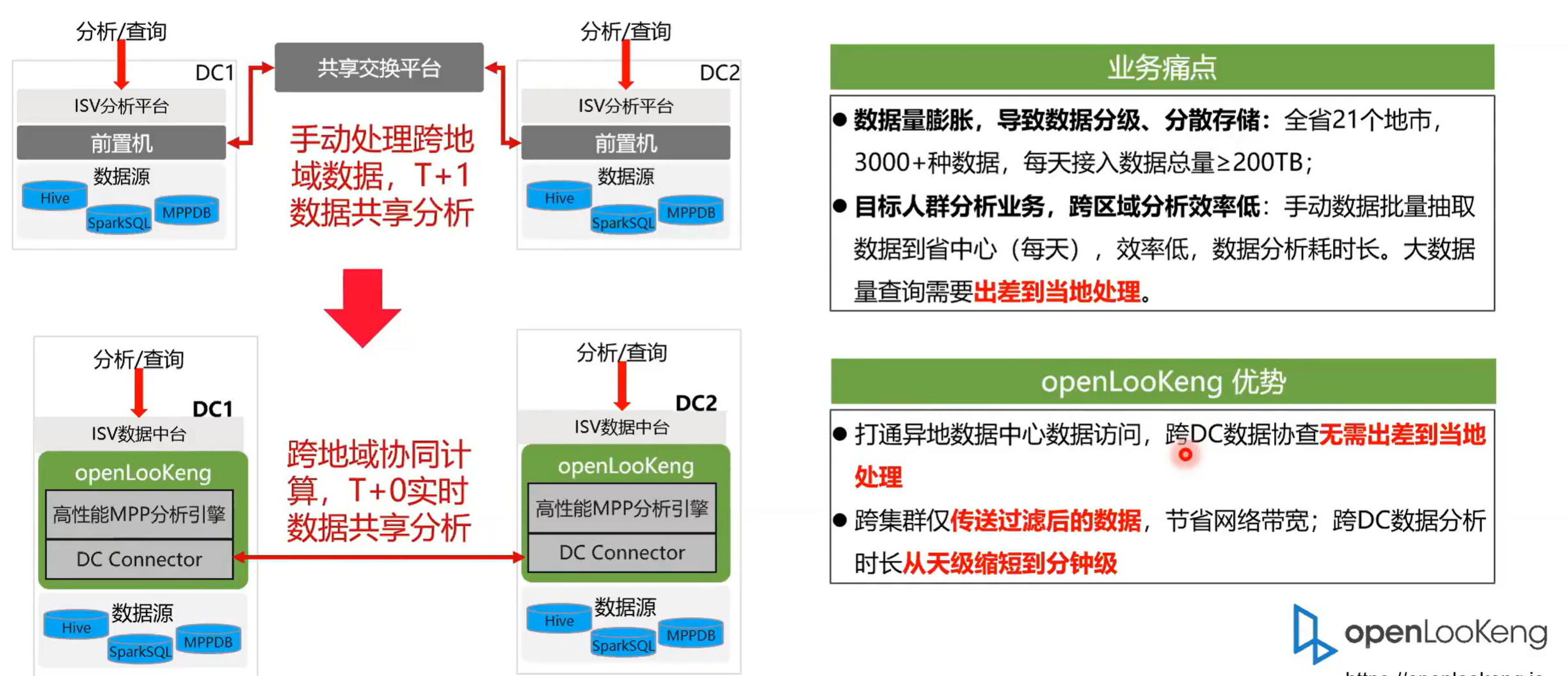通常的话我们是需要把数据手动的导入到需要访问它的一个DC 里面去通openLooKeng的 DC connect ,无需人工的去搬运数据,然后同时通过openLooKeng DC connect 提供的比如说算子下断点续传以及数据压缩并行传输等特点来提升跨域的一个访问能力,把之前的从天级别的分析速度提高到分钟级的一个分析能力。