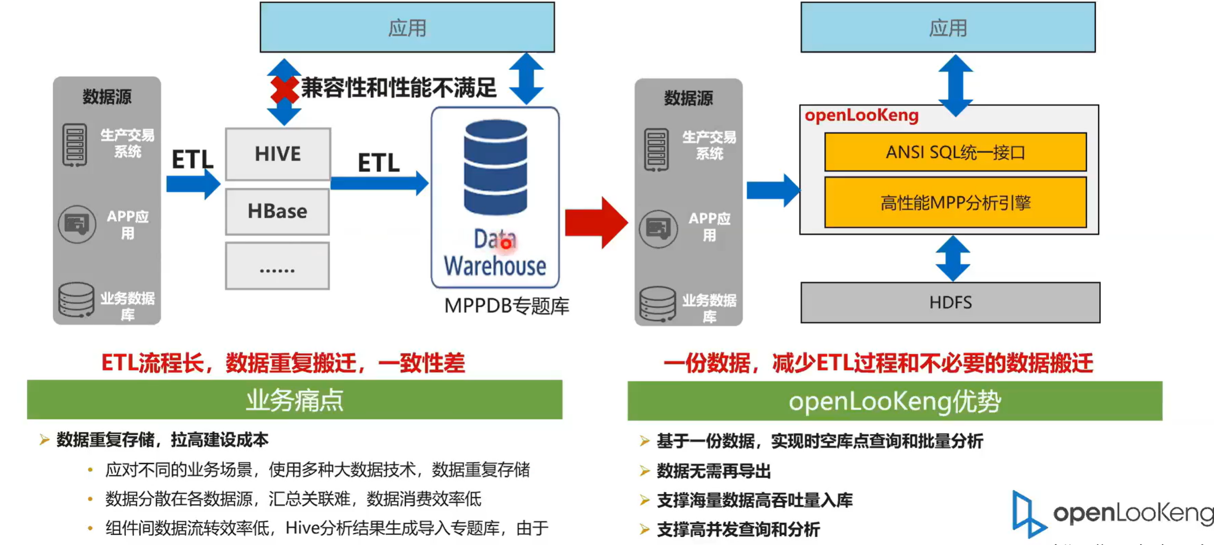 以前有一个典型的流程就是生产数据经,首先是流到 Hive 或者是流到其他系统,然后再流到一个专题的数据库里面。比如说 Oracle 、mppdb这种的话,一个典型的特征就是 ETL 流程长,数据重复搬迁,一致性差。同时有个很大的业务痛点就是提拉高了建设成本。