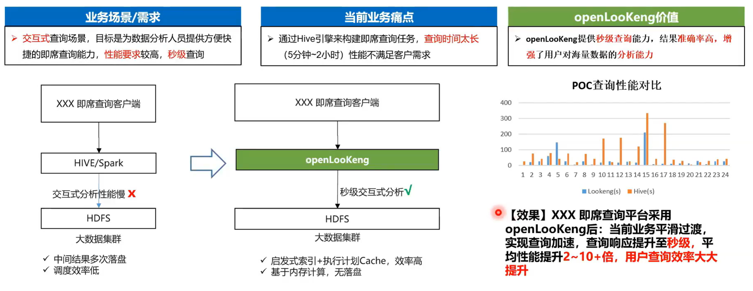那这是第一个场景,通过openLooKeng的话,我们可以使用它的域跨源能力实现数据关联分析。第二个就是大数据实时数据实时分析场景,这个主要是通过openLooKeng的 Kafka connector 这种数据兼容能力,可以实现数据实时的录入,然后实时的对数据进行分析。第三个的就是引擎接口,就是实现一个跨域跨源的数据分析,比如说我的底程有 Hive 和 mpb 数据源,由于这两种数据源它的本身的接口是不一样的,Hive使用的是 Hsql ,然后MPPDB所是使用的是标准的 SQL ,他们在分析的时候由于他们俩的接口不一样,然后需要写不同的语言对他的数据进行一个读取,然后在上层的平台进行一个关联分析,然后下面的几个应用场景也是在实在实际中用到的一个场景。第一个就是 OPPO 跟的用 OPPO 跟去替换 Hive 或者 Spark 目标的场景是这样子的,交互场景目的是为了分析人员提供或是为数据分析人员提供更方便快捷的机器查询能力,性能的要求是很高的,通常是秒级查询。这个是在我司应用的一个场景,他开当前的话之前他们用的是 Hive 然后中间的有一个比较明显特征是中间结果落盘次数比较多,然后调度效率低。而通过使用 open 螺根然后同时以使用了 open 螺根的启发式索引、执行计划、cache等一些技术。然后还有一个比较典型的特征是 OPPO 跟本来是基于一个内存的全 pipeline 的一个数执行模式,这样的时候数据是没有落盘的,最终效率是提高了两至十倍。这是一个在我市应用的一个场景。然后第二个就是融合分析的场景,就统一 SQL 跨源融合分析。我们看就是下沉有三个数据源,一个是 Hive 一个是 hbase 一个是 ES 这样话通过以前的话就你可要通过不同通过他们各自的 connect client 把它的数据拉取上来,然后通过一块源的综合分析程序来实现一个关联分析。那么的话这个一个就是你的开发成本很高,然后你的效率也很低。就很完美的解决这个问题。