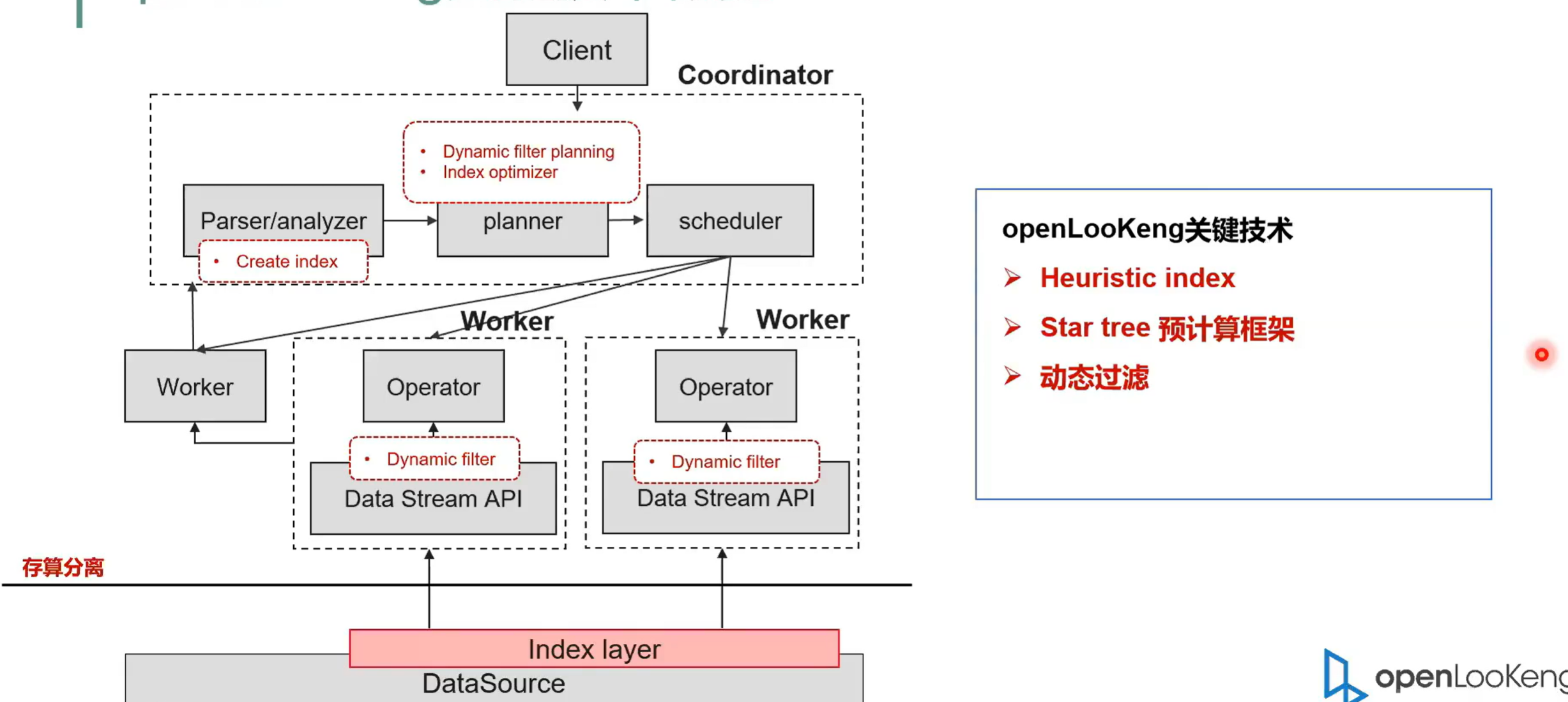 openLooKeng重要特征,一个就是索引。索引的会创建一个外置索引,我们提供了 create index 等命令,让用户去根据需要去创建比如说 mini max brow failed bitmap 以及 B +树这种索引。然后在数据读取的时候,我们会去用这用索引去过滤分片,同时也可以用这种索引去获取。