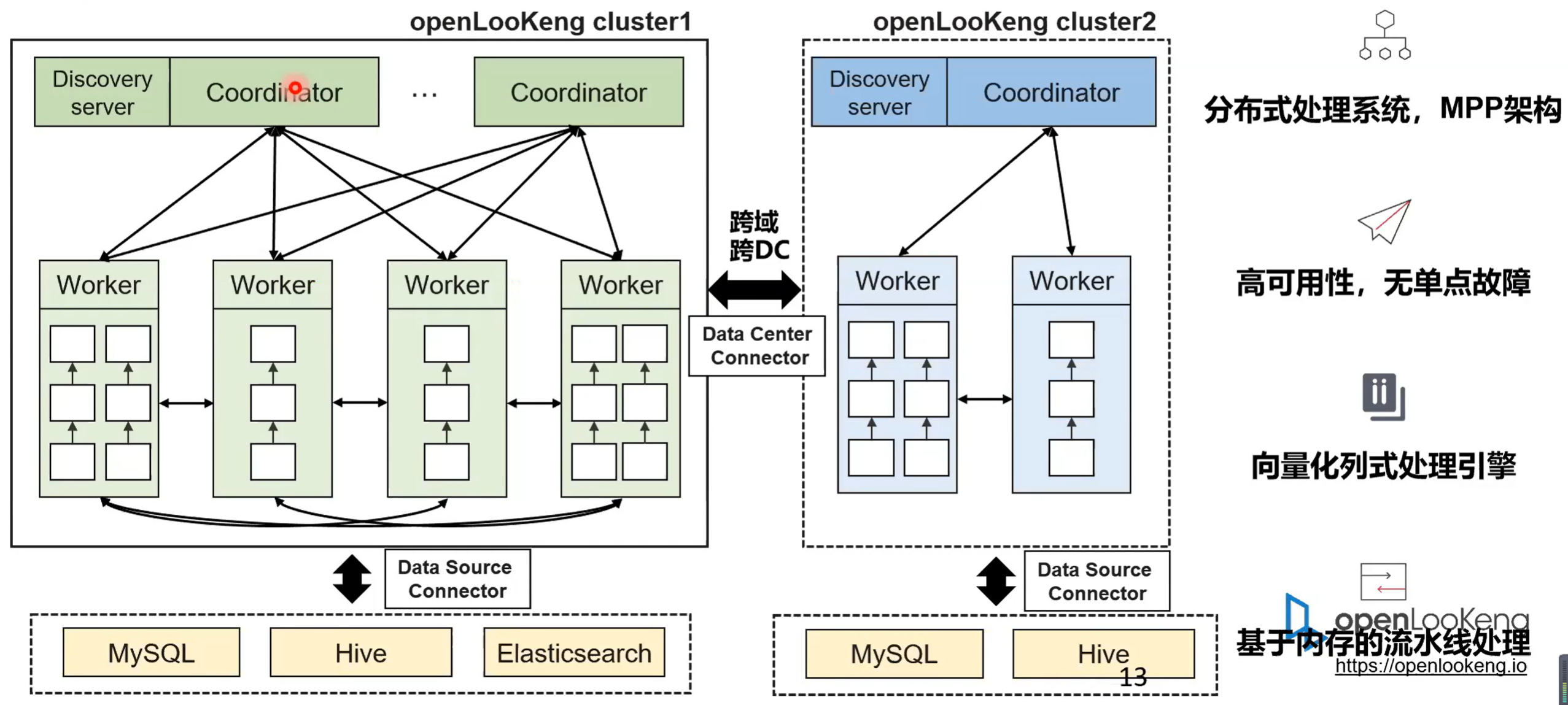 DC connector 走的是 JDBC 的方案,openLooKeng是一个典型的 MPP 架构,高可用无,单点无单点故障。因为之前 codinator 是单节点的,现在我们已经实现了 codinator 一个双活的特性。然后openLooKeng是一个向量化的存储引擎,是基于内存的流水线处理。相比于 Spark 的话,它是一个基于内存的完全的 pipeline 的一个处理引擎,这也是openLooKeng相比于 Spark 性能有提升的一个重要的原因。