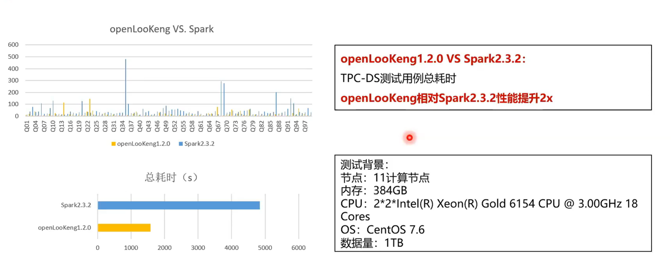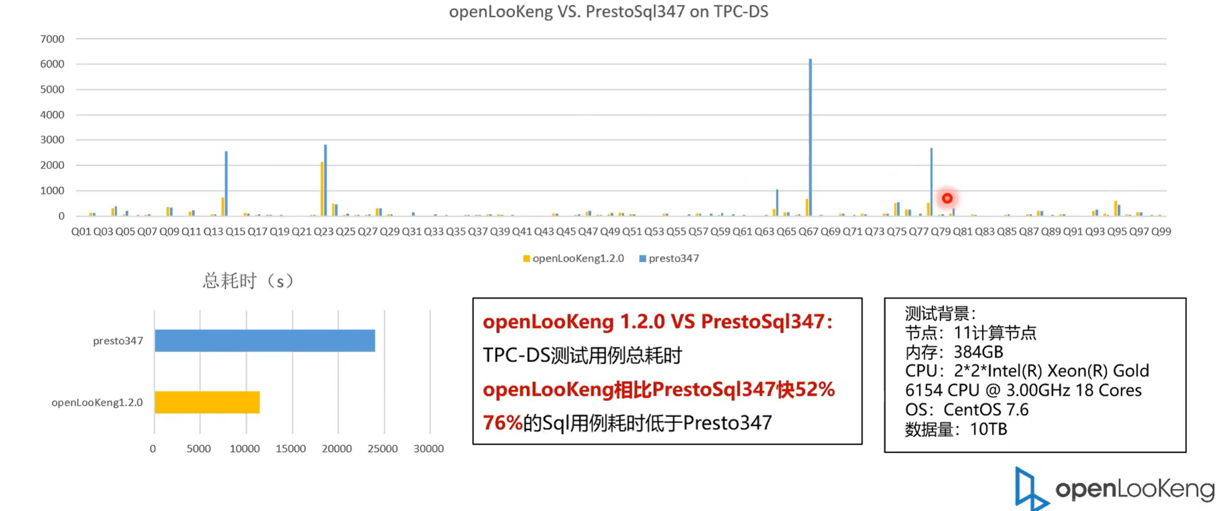 openLooKeng引擎相对与其他引擎的一个性能的优势,对标的是 PrestoSql,源自开源,领先开源。我们当前是用的是十一个节点,每个节点是有238 G 的内存,CPU 的特征列在上面,大家可以仔细看一下,然后测试的数据集是 10 TB 的。我们首先我们可以看一下整体的耗时。 openLooKeng 是用了大概 11,000 多。然后是然后 PrestoSq 347 是用了将近24,00。也就说openLooKeng 1.2 相对于 PrestoSql 347提高了52%,其中有 76% 的 SQL 用时使用率是低于 PrestoSql 347的。可以看到一些典型的,就有有一些 SQL 是体现的很明显的。