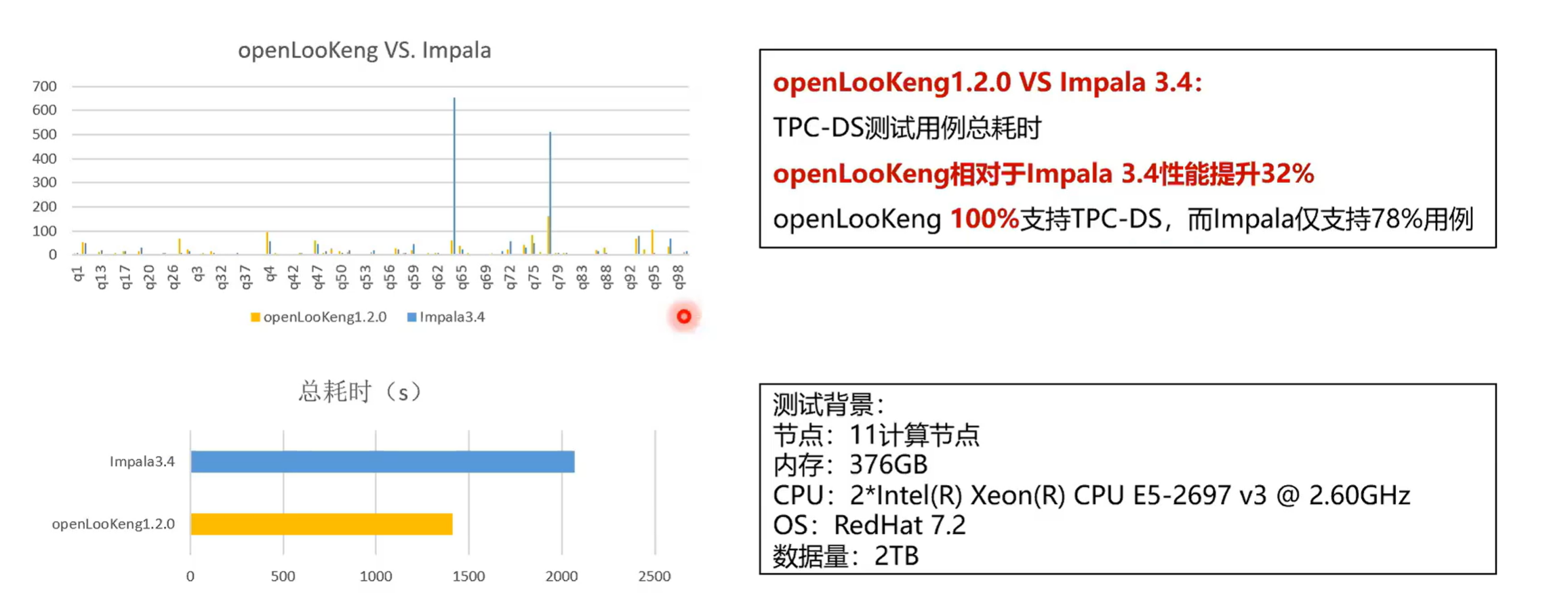 第二个就是对标impala,可以看到它整个的环境还是和之前一样。是十一个节点,内存稍微小一点,数据量是2 TB。首先看一下它的整个的延时openLooKeng 大概在 1400 秒,然后impala是在 2100 多秒。openLooKeng 是对 tpc-ds 是 100% 的支持的,impala它仅仅是支持了78%,它有一些算子是不支持的。