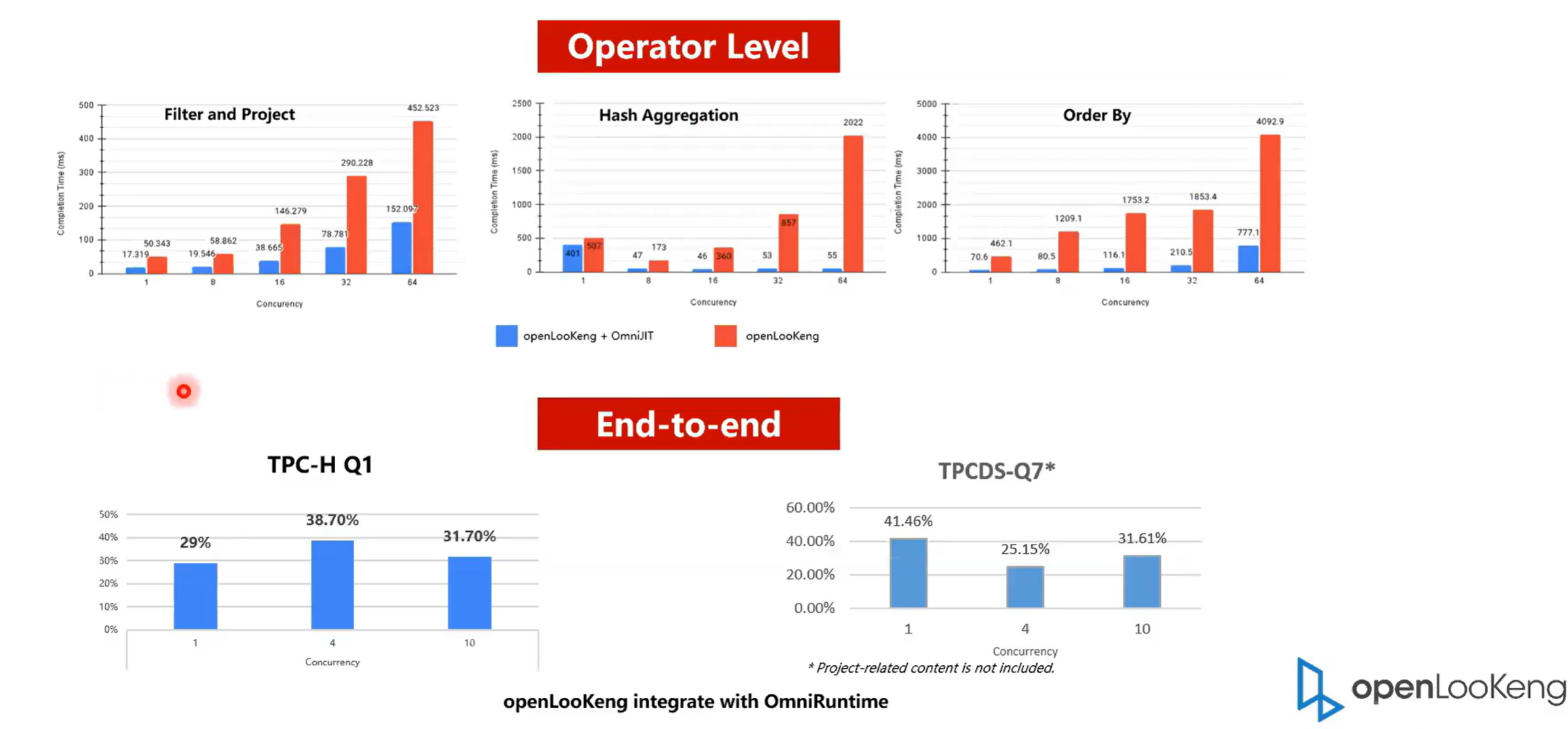 首先是从 operator 级别,然后是端到端的一个性能提升,可以看得出来就是在算子级别,OmniRuntime:提升的还是特别的明显的。举个例子,就是 filter hash X 其他都是有数倍的提升,最大的提升可能有 10 倍,但是单个算子在整个的 SQL 中的占比会比较少。比如说整个 SQL 中 hash贡献只占了20%,那最多也就是提升 20% 。我们可以看一下单个就是针对于端到端的一个性能提升, tbch 的Q1,可以看在一并发和四并发以及十发的时候,它大概都有 30% 左右的一个提升。