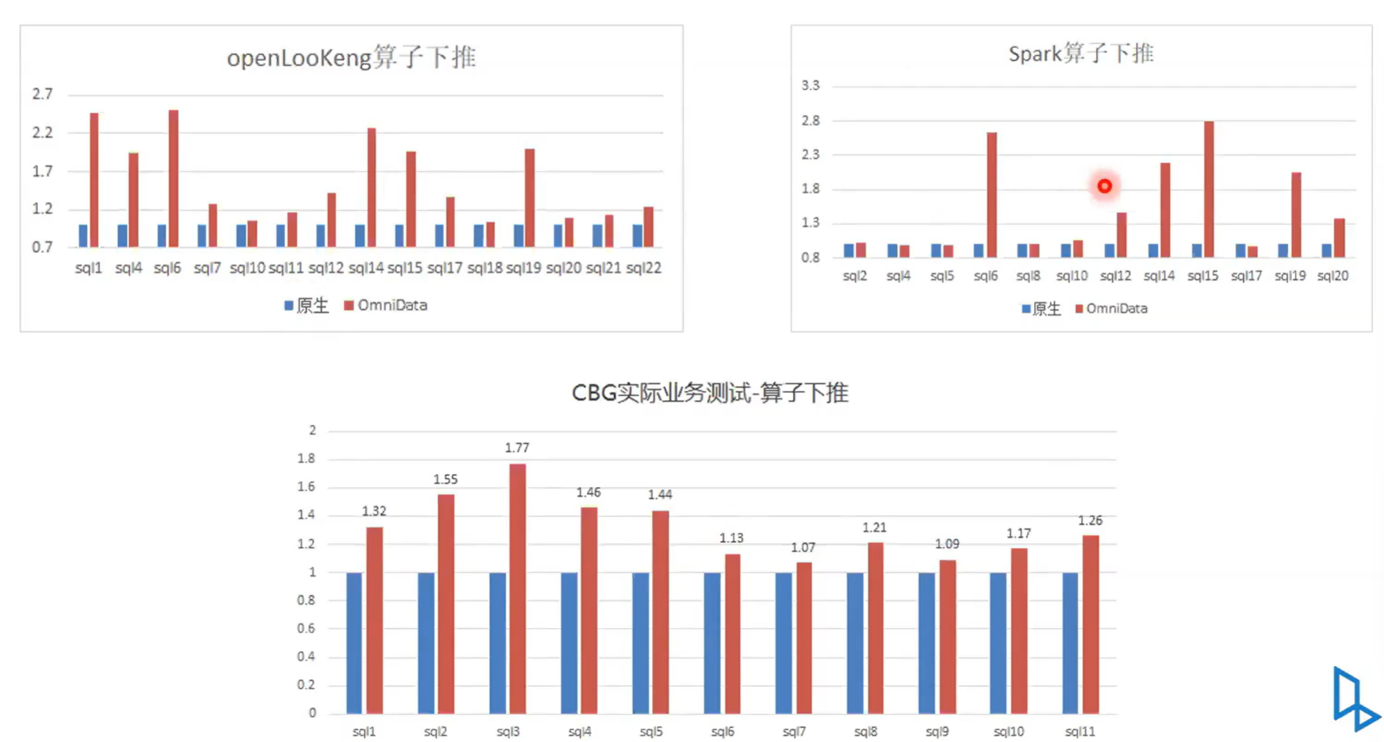 接下来我们可以看一下就是OmniData性能,左侧是openLooKeng引擎,右侧是 Spark 引擎,然后这个是在 实际业务上测出来的。我们可以看出整体上提升的效果还是挺明显。无论是 Spark 引擎还是openLooKeng引擎。接下来是在实际的业务中一个性能测试,性能是归一化的。