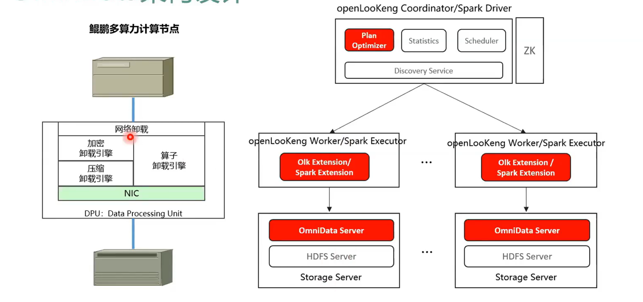 ominta 本身的一个目的就是把算子以及它的加解密以及它的解压缩这些算子推到存储团存,推到存储的 CPU 或者是 DPU 上去。因为现在 DPU 也其实一个很火的概念,大家很多公司都在做,然后就是把用多就是用多出来的算力减少,从而减少那个 C 现在以 CPU 为 CPU sentry 的那种结构模式,架构模式 of 缓解 CPA 的压力,本身 DPU 上可能还会带有那种解压缩或者是加解密的引擎,从而我们是应用上硬件的能力来加速整个 SQL 的执行。这样的话我们可以看出在右图我们可以看出是以它的一个整体的架构。我在这里画的是一个纯算分离的场景,就是在 open log 它是由 coinator 就是这个框和 worker 这两个组件组成,然后存储端是 HDFS 集群。然后我们可以看的就是我们红色的部分代表我们的一个修改我们增加了一个 omindata server 这个 omedata server 其实就是用来管做算子下推的。然后同时我们会在执行计划层做一些修改。因为我们现在的需要把算子下推到 admin data sever 里面去。所以我们在执行计划优化的时候会去识别哪些算子能够适合下推。比如说我们会根据算子的选择率,把算子选择率就是把算子最终的选择选,把算子选择率低的推到面对实验我去。比如说之前我这个表是 100 万行,我过滤之后只有 1 万行,选择率就特别适合推送到数据端去执行。