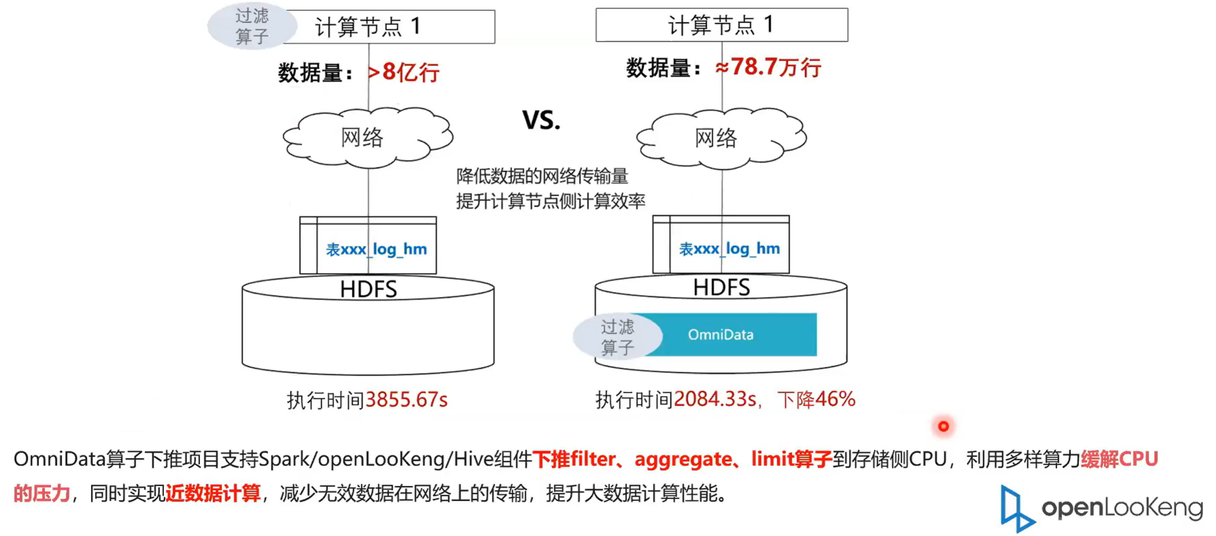 下面介绍是OmniData数据计算,就是比如说我们现在要做一个数据分析,通常我要去分析一个表,然后通常我们会带那种过滤条件,然后我从下拿 8 亿行的数据,然后通过OmniData推到数据存储端去计算。原理就是一个 NTP 的数据计算的一个原理,就把数据的把算子把能够推的算子推到进数据端去执行。然后我们可以看到它最终上来的数据只有 78.7 万行,然后执行时间从之前的 3800 多秒下降到了 2084 秒,这个是在我司的一个真实的案例。