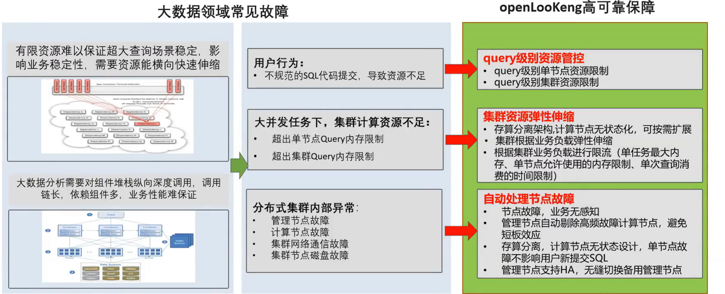 openLooKeng在故障域的处理主要是分为三部分,一个是 query 级别的资源控制。就是可以对单条 query 的使用的资源进行一个控制。第二个就是集群资源弹性伸缩,,因为openLooKeng 的 worker 是一个无状态的,可以实现按需的动态扩动态的扩展或者是收缩,第三部分就是自动化的处理节点故障,然后节点故障是业务感知的。