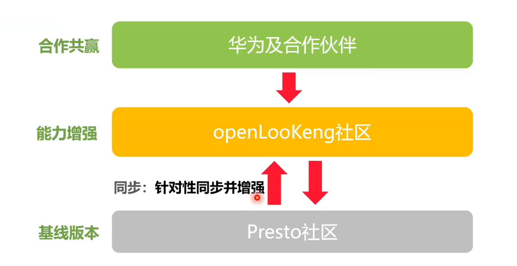 openLooKeng和 Presto社区的一个关系是同针对一些大颗粒的特性会同步过来。同时会做一个能力的提升。我们是基于开源,然后就是超越开源,就是从基线版本会做一些很多的性能提升,实现能力的增强。同时如果有新的大颗粒的出现,我们会把社区的大颗粒特性根据需要。比如这个需求这个特性是很有必要的,我们会移植过来。然后第二部分就是其实也可以看到是社区也在应用openLooKeng的一些新的特性。而第三就是和合作伙伴实现一个合作共赢的一个目的。