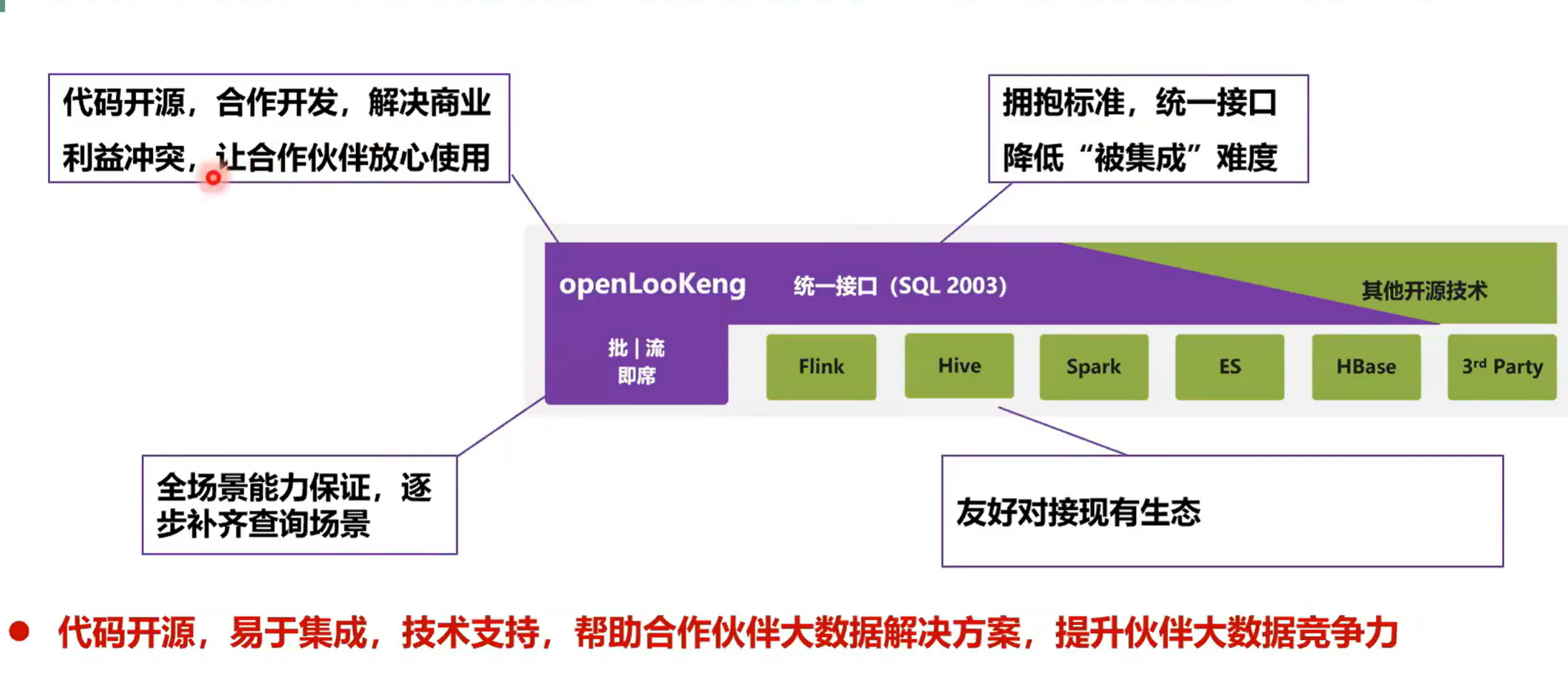 第三部分是拥抱标准,统一接口,降低被集成的难度。openLooKeng提供了一个 SQL 2003 的一个接口,就是估计大家使用 SQL 比较简单,然后大家都习惯于使用 SQL 来进行一个数据分析。然后第二部分就是全场景的能力。第三个就是全场景能力的一个保证,逐步补齐查询场景,第四部分就是友好对接现有生态。比如说现现有生现有的数据源中,我可以对它实现一个灵活的访问。+