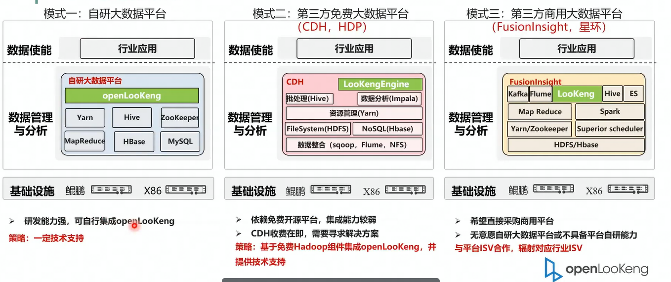然后我们可以看一下 SV 的三个对接方式。第一种是自研的大数据平台,这种方式的话就是需要手动的去集成 OPPO 跟这样的话需要的 SV 能力状态的要求能力,能力的要求状态会比较高,它需要自行的去集成openLooKeng引擎,当然我们一定会给予基础知识。然后第二步就是基于现有的免费大数据平台,比如说 CDH 去集成openLooKeng引擎这个的相对来说就会相对来说比较简单一点,因为它本首先它的底层的组件都是一个开源的通过开源的组件构建出来的。然后本身openLooKeng也是开源的,然后底层的组件也都是基开源的。