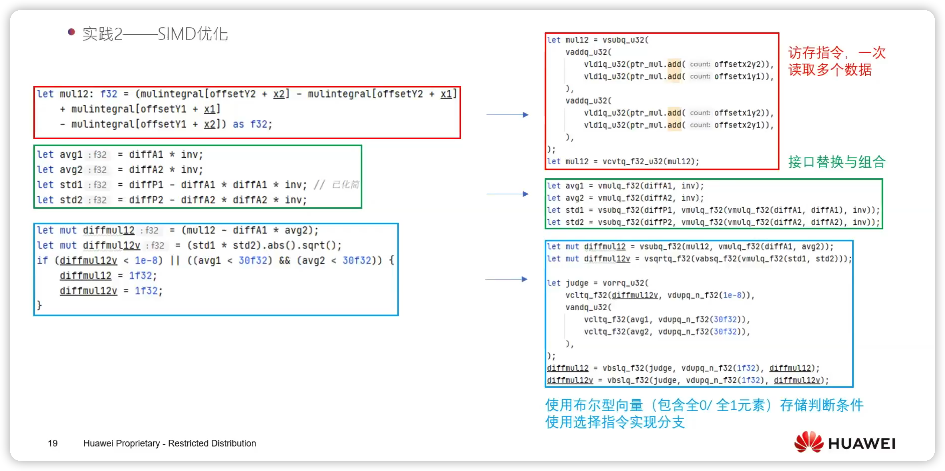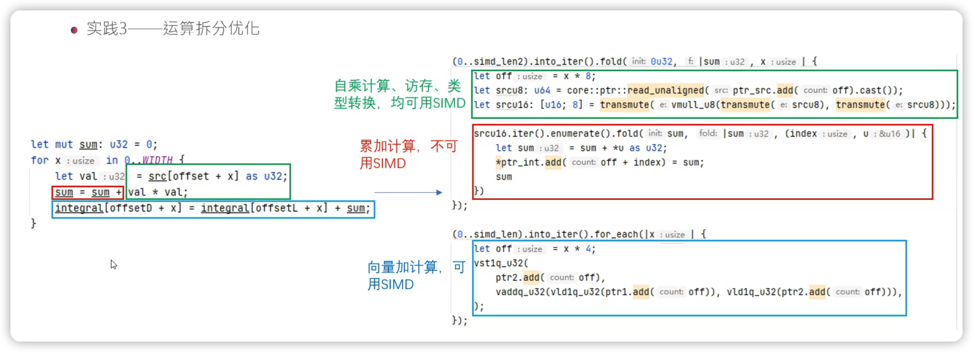 左边是一段连续的三段代码,可以按照顺序分为三个部分,每个部分都对应了 SIMD 优化的方式: