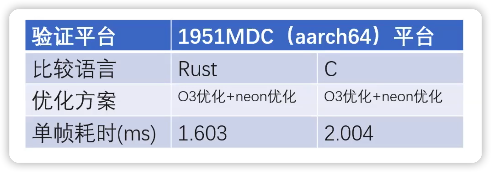 Rust 语言相比于 C 语言来说,能获得的最高效率还要快 25% 左右。当然,这并不代表 Rust 语言在效率上天生有优势。而是在计算加速的使用上 Rust 程序做的更好。
