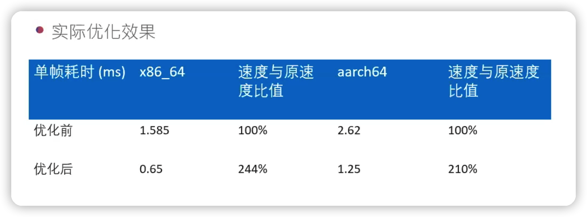 在 x86_64 CPU 架构中我们优化前的单帧耗时为 1.585 ms,而优化后的耗时减少一倍到 0.65 ms。同理在 aarch64 架构的 CPU 优化前是 2.62 ms,优化后也减少到 1.25 ms,有着相同明显的效率提升。