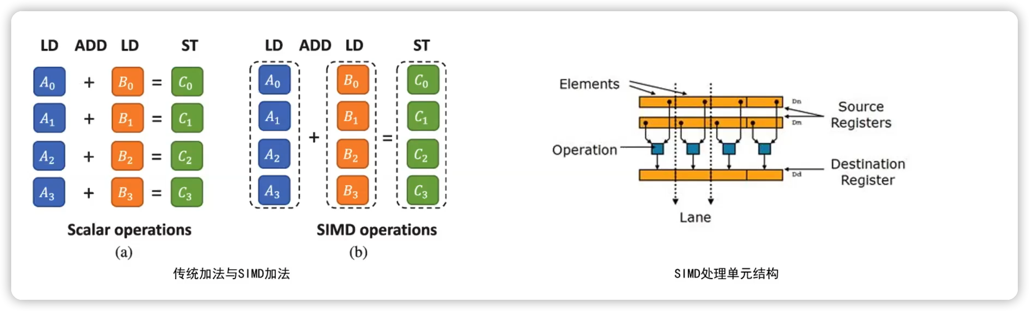 底层的硬件架构,每种 CPU 架构类型提供的 SIMD 指令都是该架构专用的,这就导致了同样的运算会对应不同的 SIMD 指令。