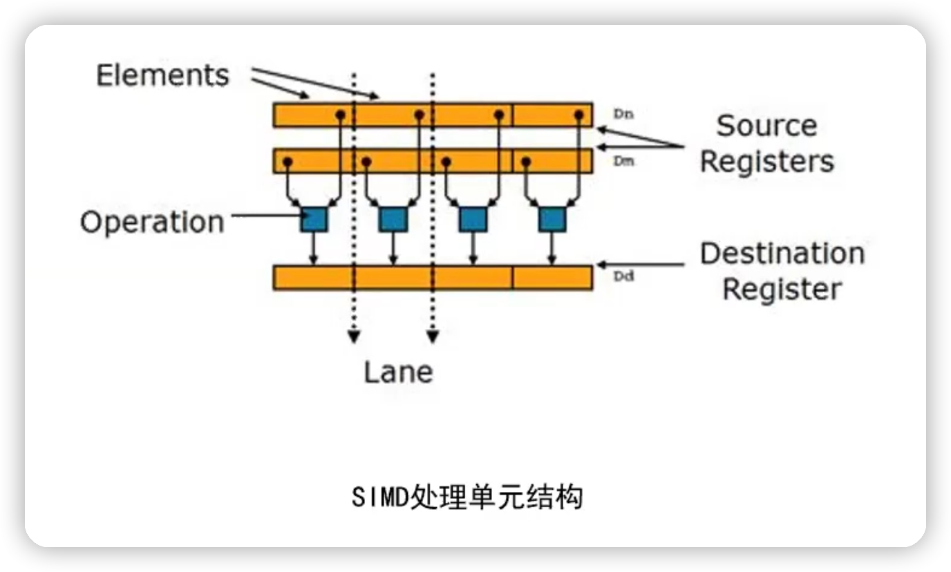 目前主流的 CPU 架构比如 X86、ARM、MIPS 都集成了成千上百个这样的 SIMD 处理单元,每一个都对应了一种或多种 SIMD 运算。