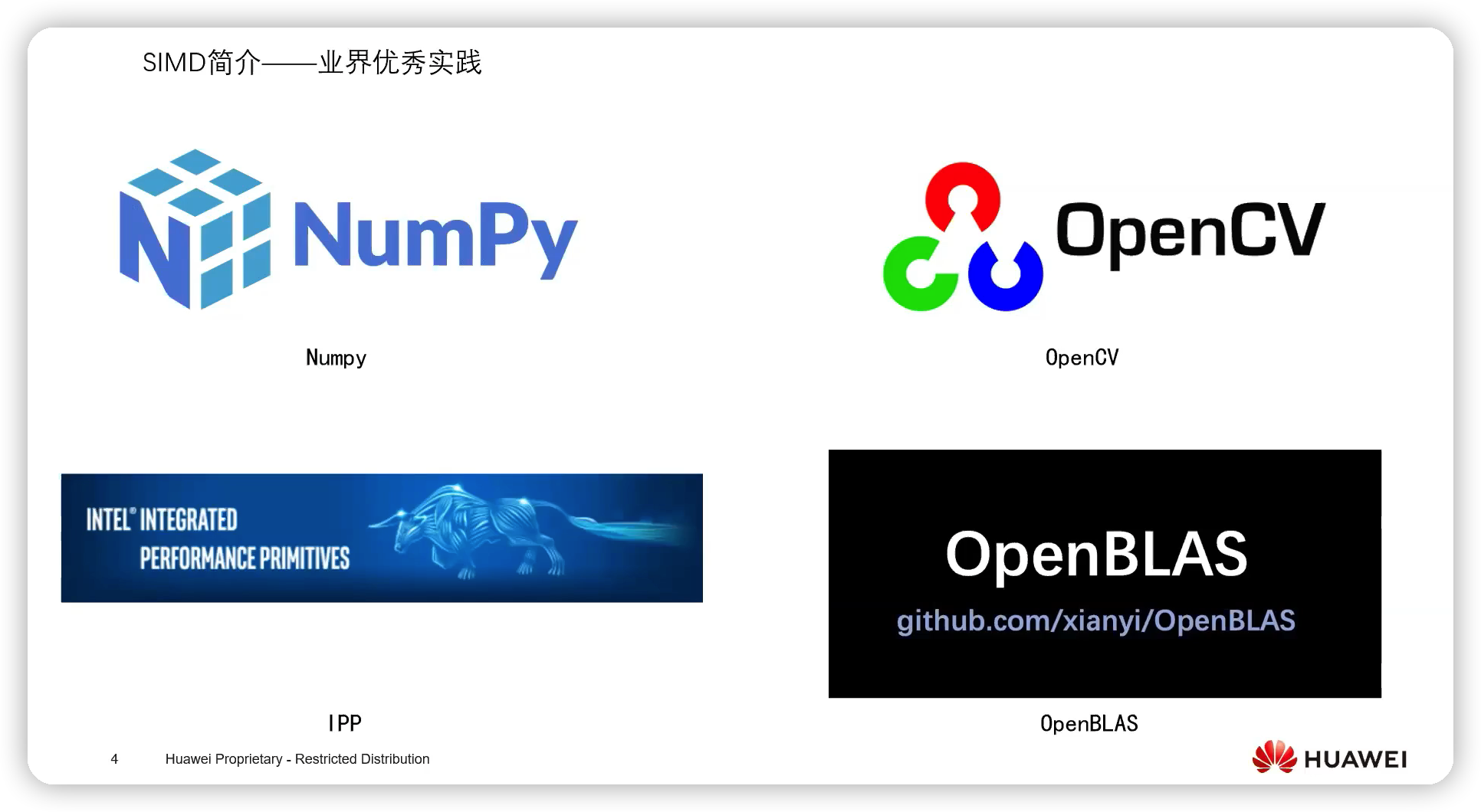 • Numpy:多维数组计算开发库,主流用 Python 语言做数字计算开发,它的实现中有许多地方做了 SIMD 开发优化。