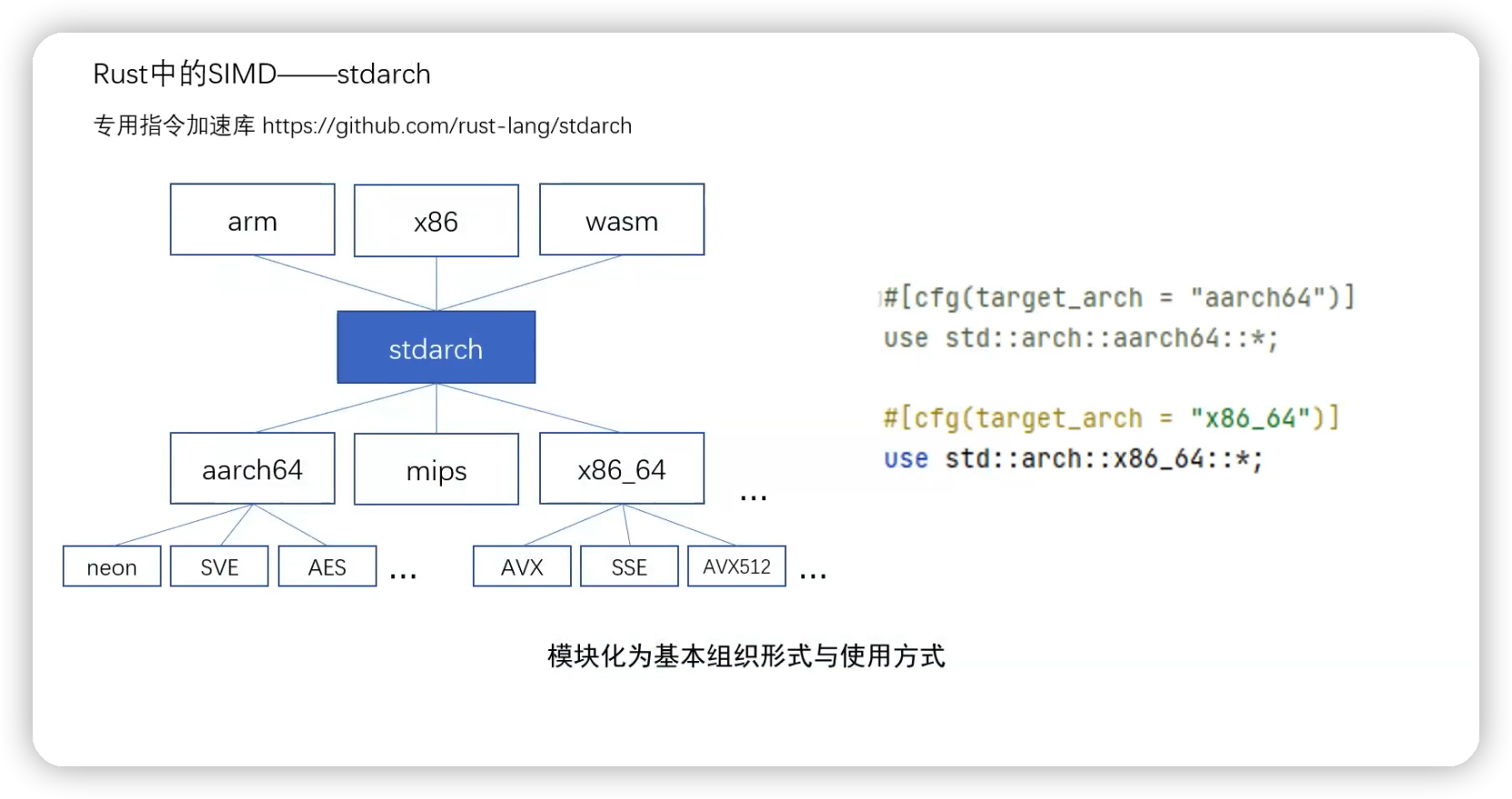 stdarch 本身存在着大量类似的条件编译代码。因此相应的指令集模块只有在满足环境的需求时才可用。比如 x86_64 架构下可以使用use std::arch::x86_64语句,却不能使用use std::arch::x86_64 或者 use std::arch::arm 语句。