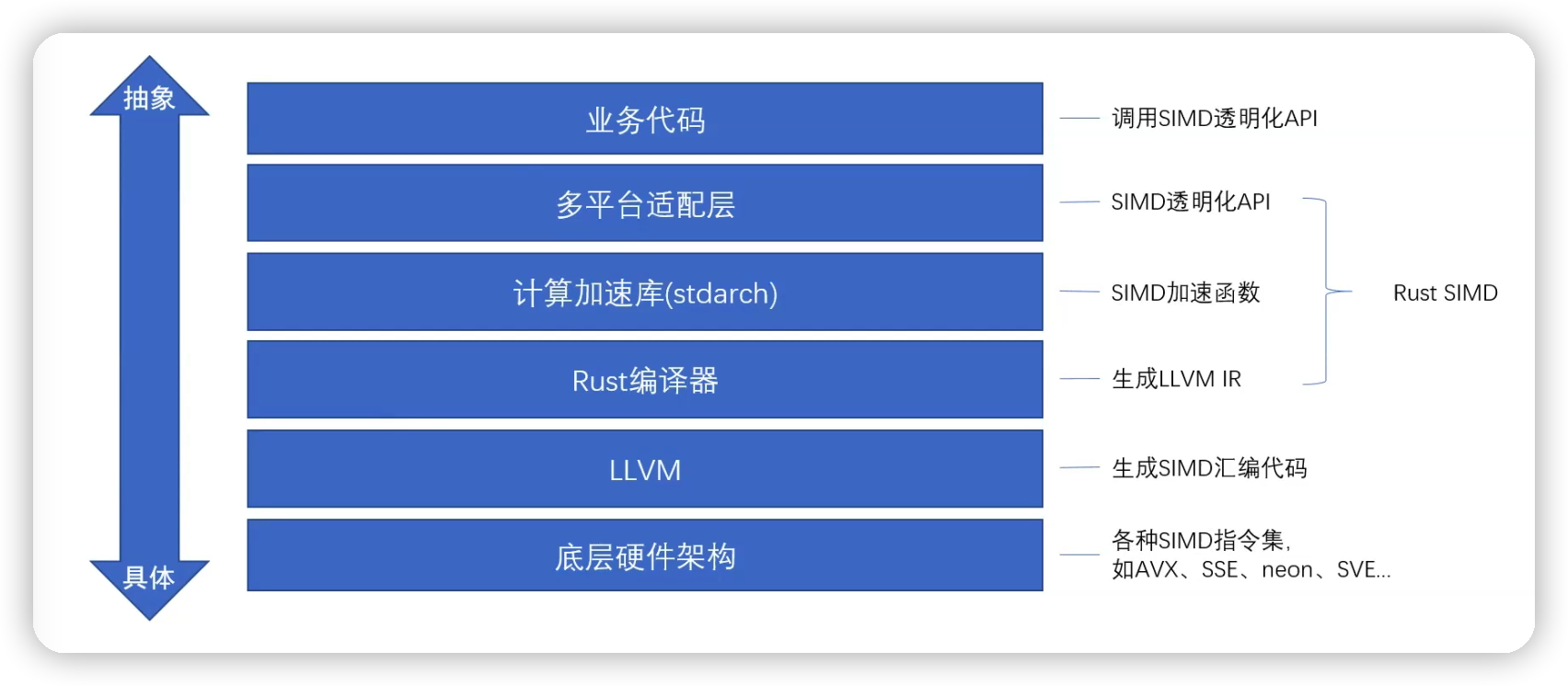 在硬件之上做了一层抽象,集成支持了各种主流的 SIMD 指令集的汇编生成。而语言编译器可以使用 LLVM 产生 SIMD 想要的汇编指令,而不用自己嵌入汇编代码,因为 Rust 语言天生就以 LLVM 作为主流后端,所以说在 Rust 中支持 SIMD 具有天然的优势,这也是 Rust-SIMD 技术的实现基础。