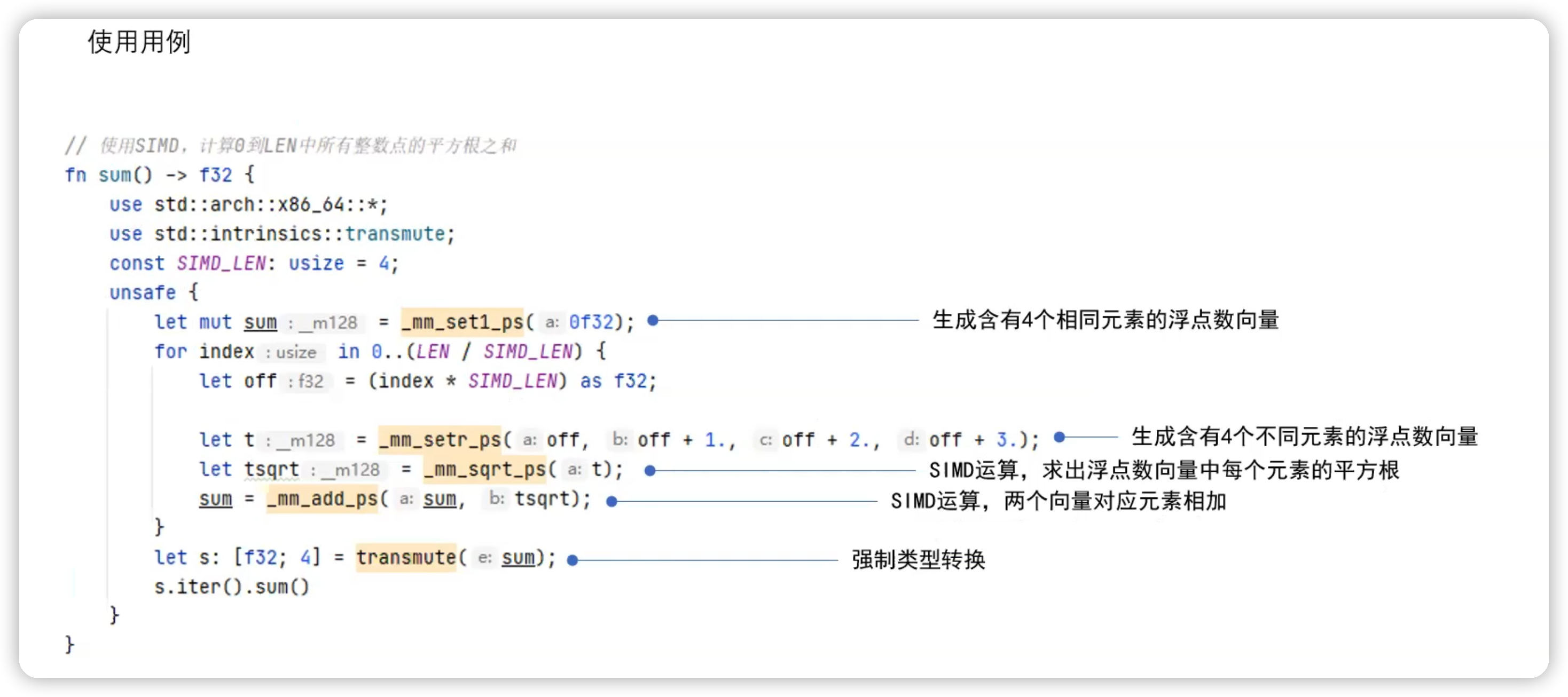 下面是使用 SIMD 计算 0 到 len 中所有整数点的平方根之和