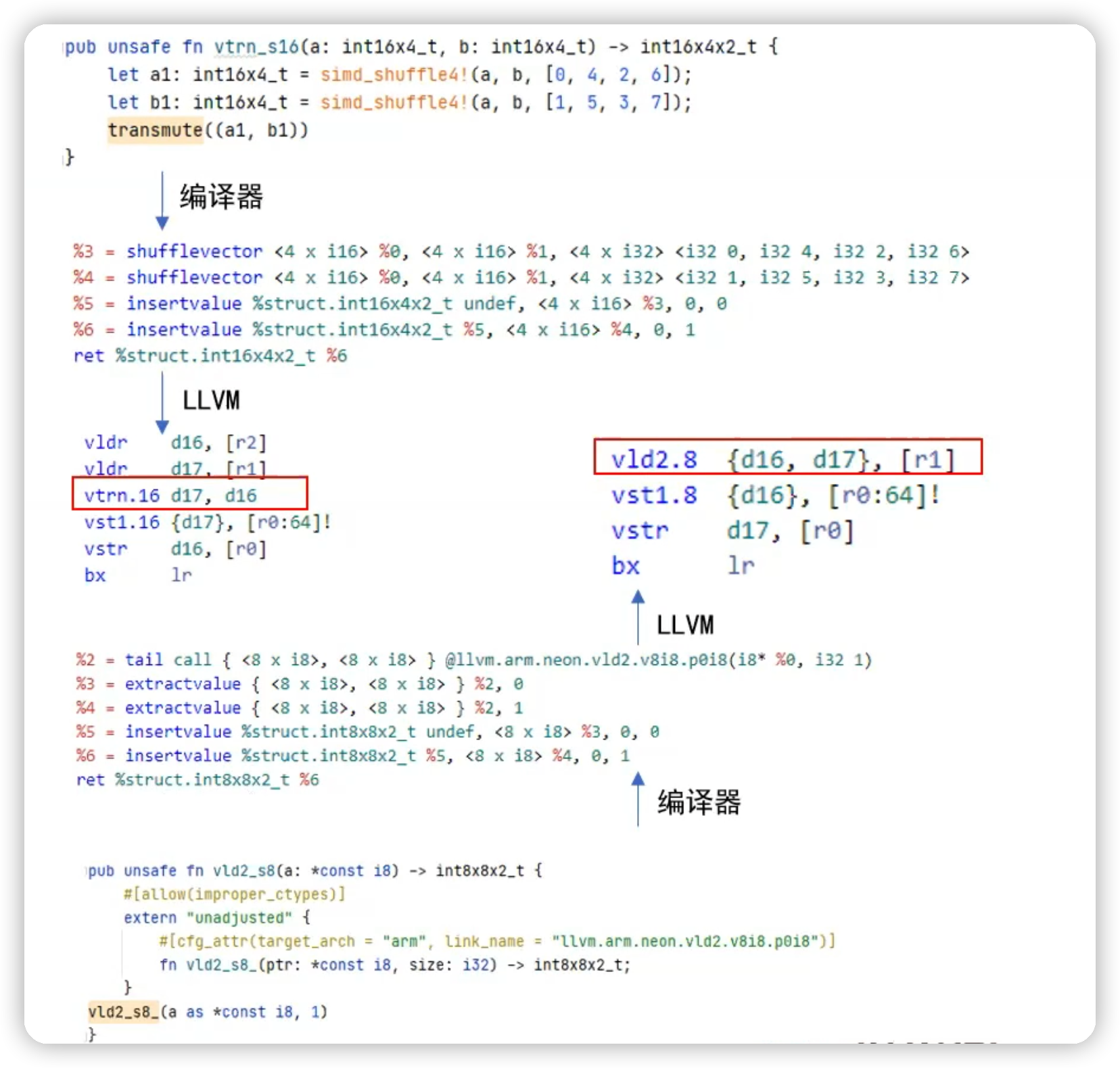 第一种:通过 FFI 静态链接的方式,生成特定的函数签名,由编译器将其翻译成正确的 SIMD LLVM IR 并在 LLVM 生成汇编室,根据 IR 终极静态链接填入相应的汇编指令集。