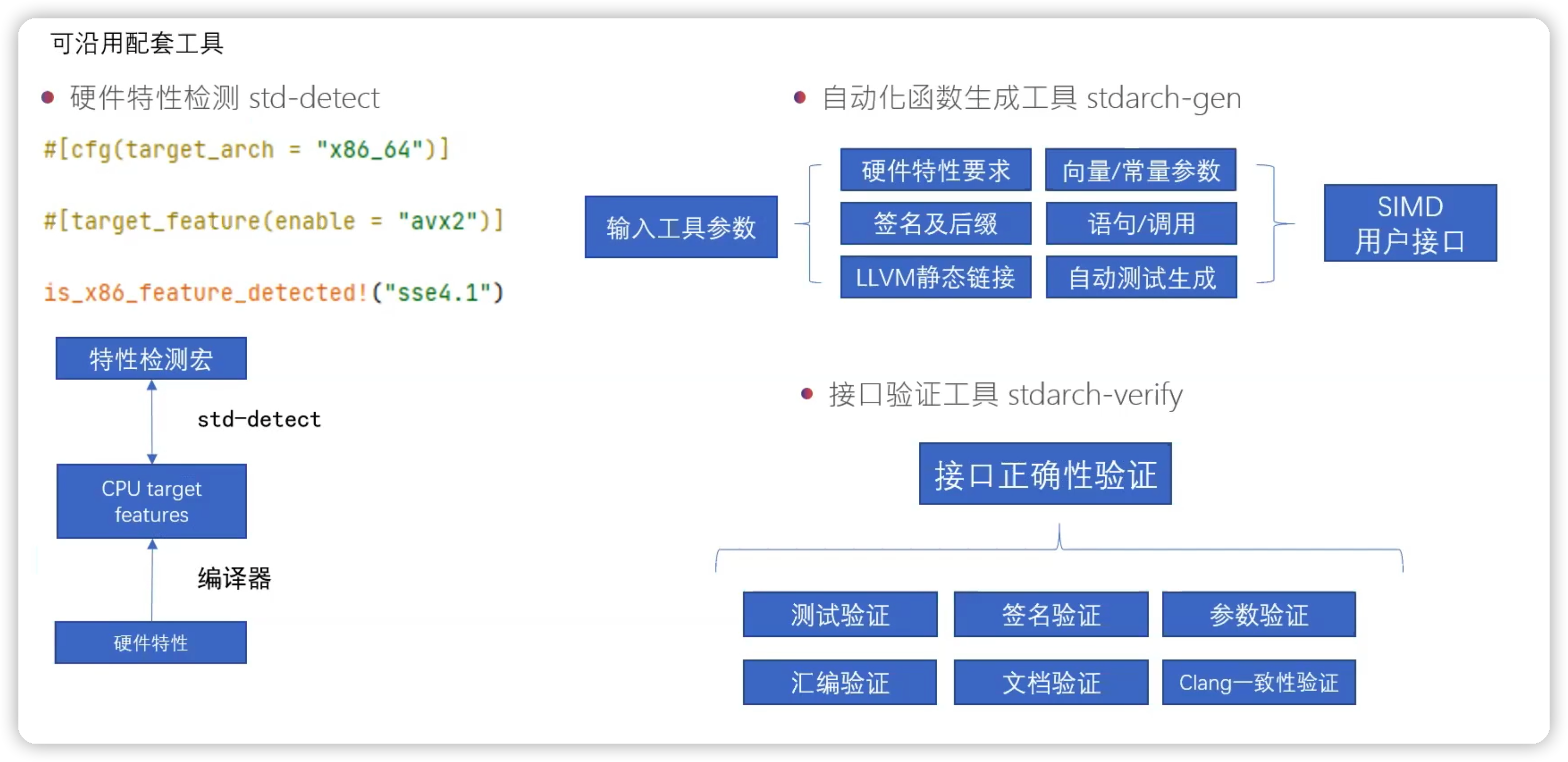 相同点:都是让用户可以用一般函数调用和传参的方式使用 SIMD 接口,其中需要使用编译器和 LLVM