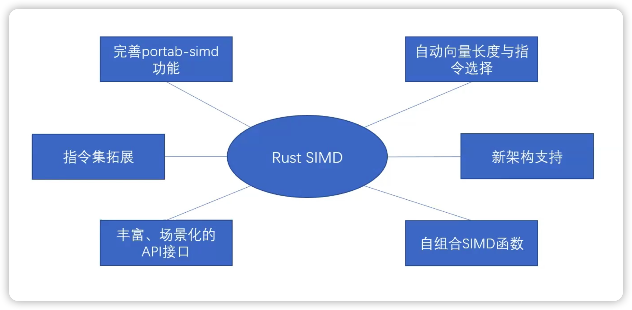 SIMD 在 Rust 语言社区中是以 RFC 被提出,经过一两年的讨论,作为 Roadmap 路径之一进行主要的开发工作,涉及从业务代码贯穿到底层硬件架构,是一个跨度大、工作量也很大的一个特性。