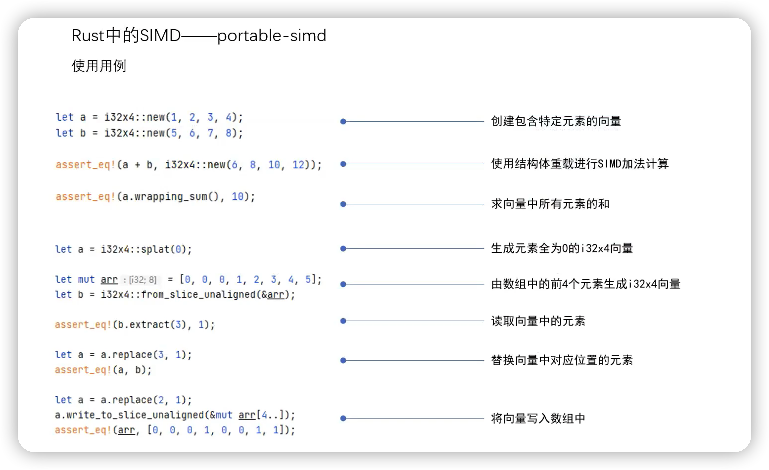 而 Rust 则是让用户通过调用标准库接口的方式,以相对低的成本自由的使用 SIMD 加速特性。