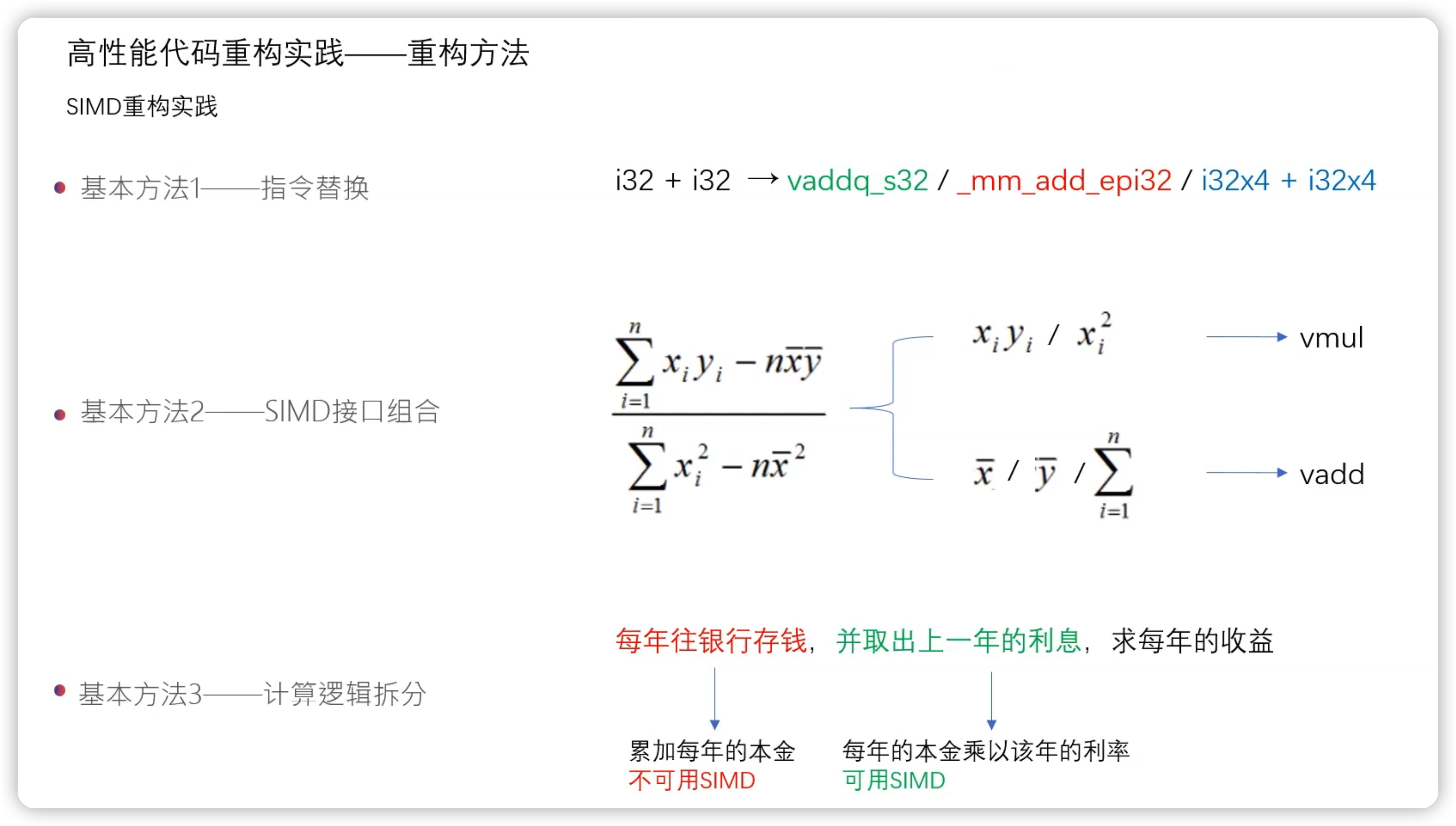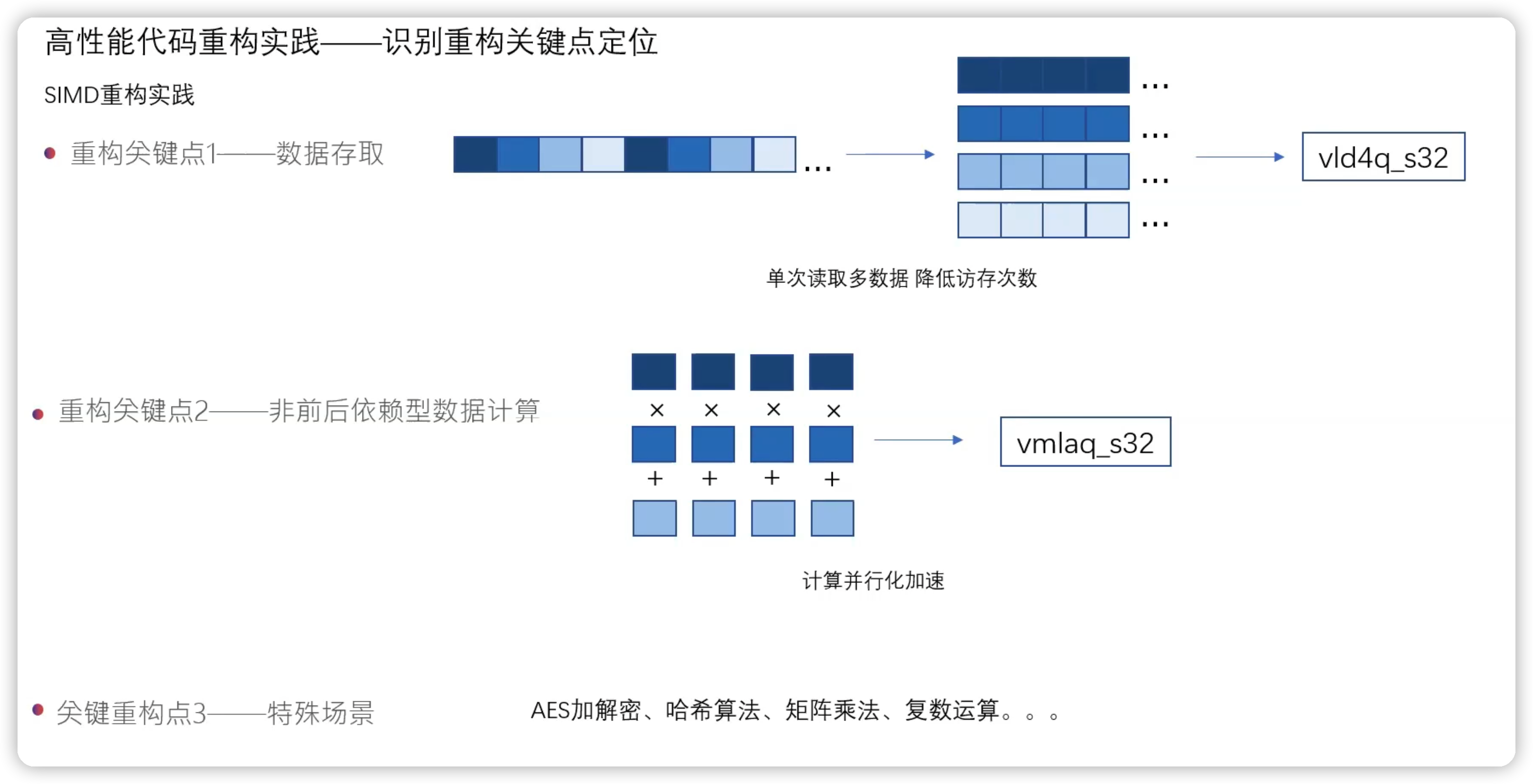 • 重构关键点 3:特殊场景—— AES 加解密、哈希算法、矩阵乘法、复数运算等都有专门为其开发的 SIMD 指令。可以直接使用。