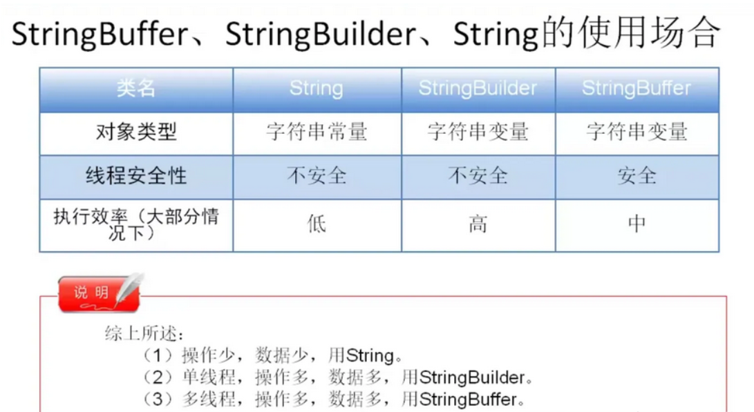 StringBuffer类中的方法主要偏重于对于字符串的操作,例如追加、插入和删除等,这个也是StringBuffer类和String类的主要区别。实际开发中,如果需要对一个字符串进行频繁的修改,建议使用 StringBuffer。