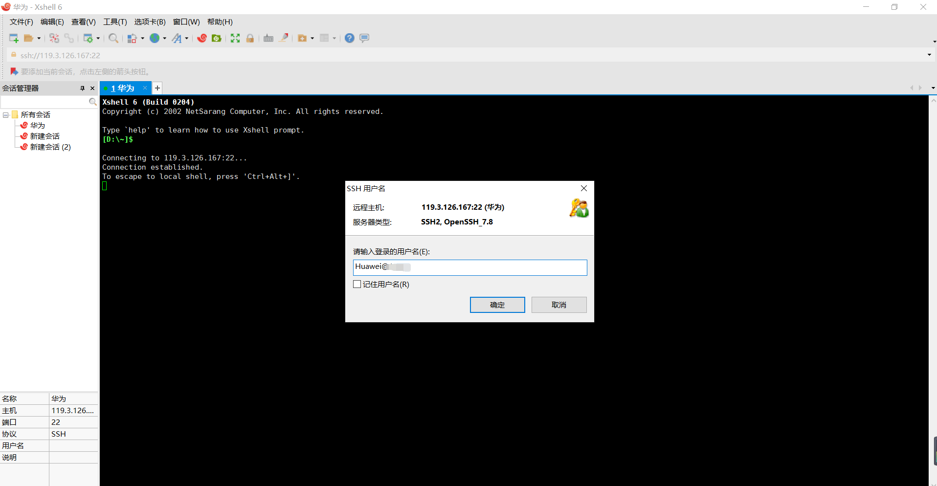 使用xshell工具直接输入你创建的弹性公网IP和密码进行连接,xshell是windows系统经常使用的ssh连接工具,可自行下载安装,这里不提供下载链接,聪明的你一定会。
