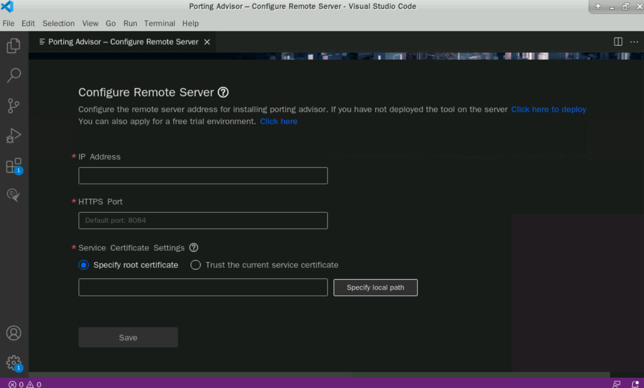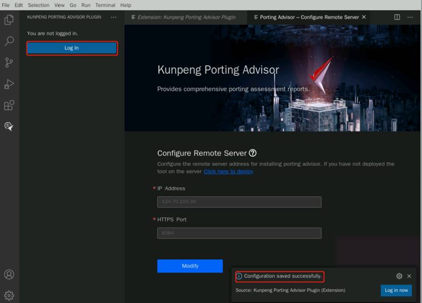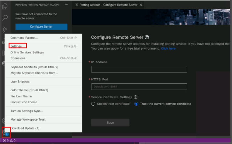 切换至xshell,点击打开“Visual Studio Code”,打开后点击鲲鹏Porting工具图标,点击“Configure Server”配置远端服务器连接,如下图所示: