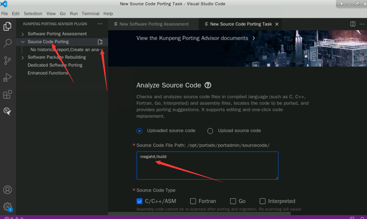 选择“Source Code Porting”,手动输入选择“megahit/build”源码包路径 ,其他参数默认,如下图所示:说明:若登录成功时有弹窗点击“OK”即可