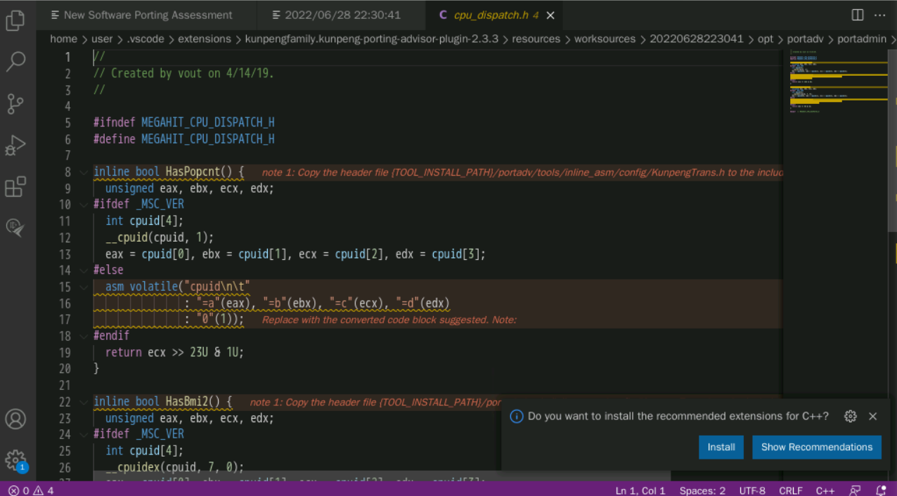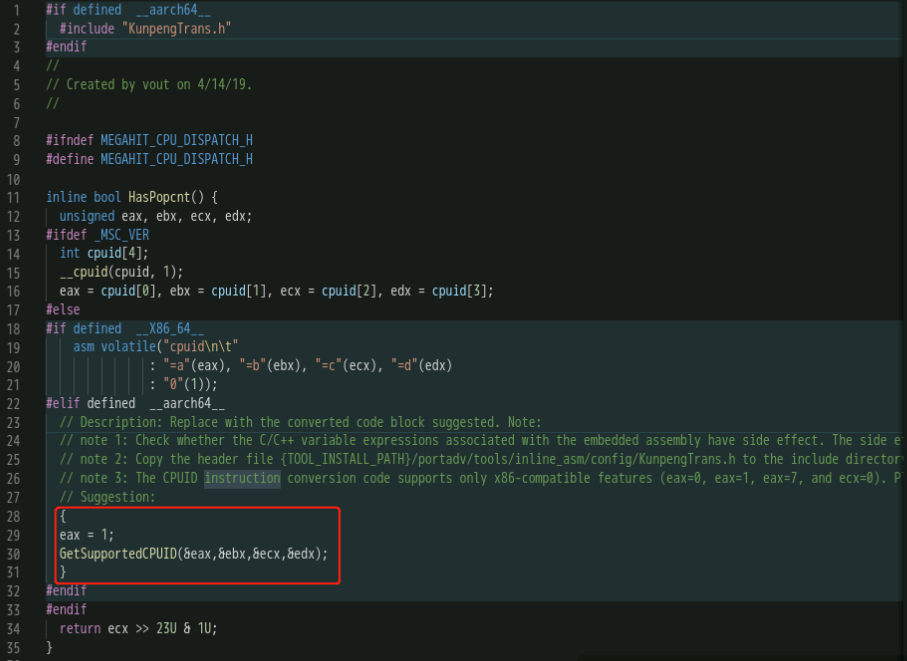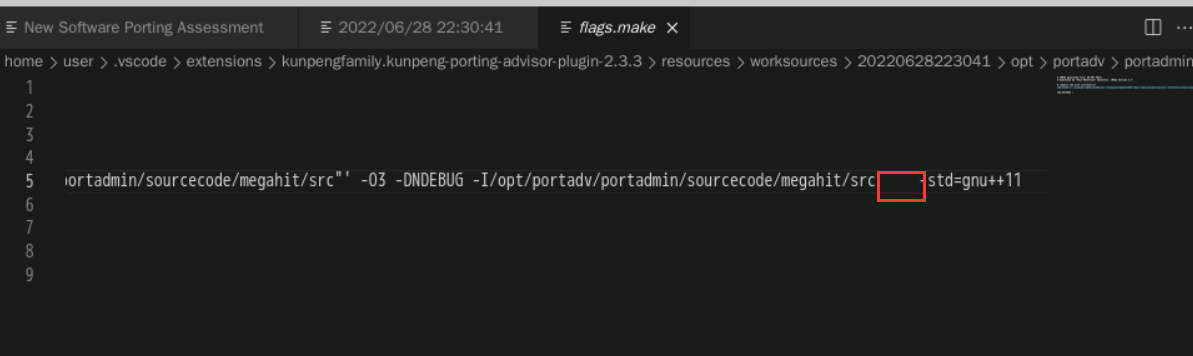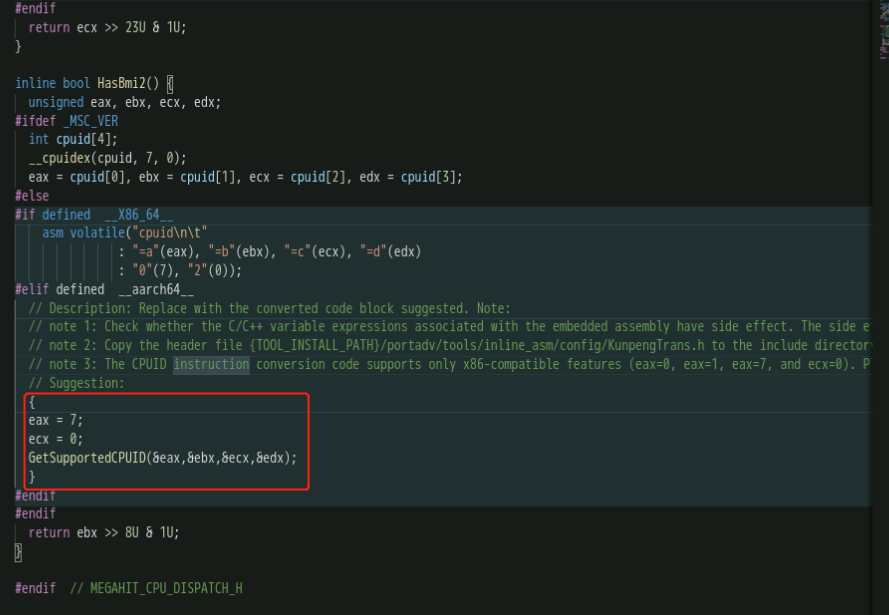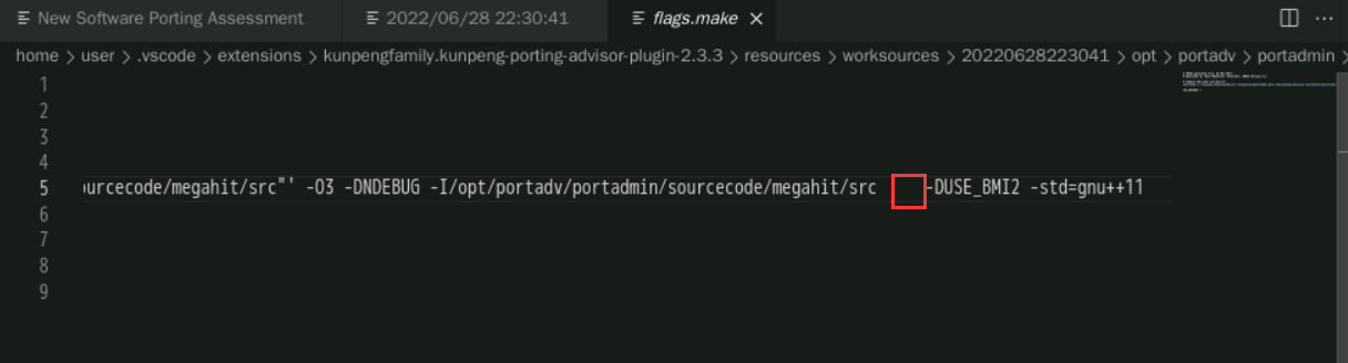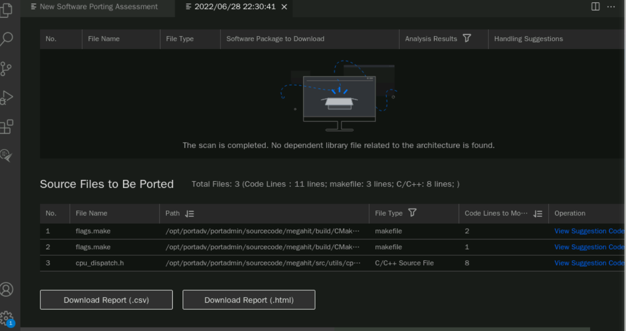 分析完成后,点击文件列表, 查看文件中需要迁移的文件,点击“View Suggestion Code”查看具体文件的迁移建议。修改文件“megahit_core_popcnt.dir/flags.make”,鼠标拖动到待修改处(向右拖动到当前代码末尾即可看到), 可以看到一处待修改点。