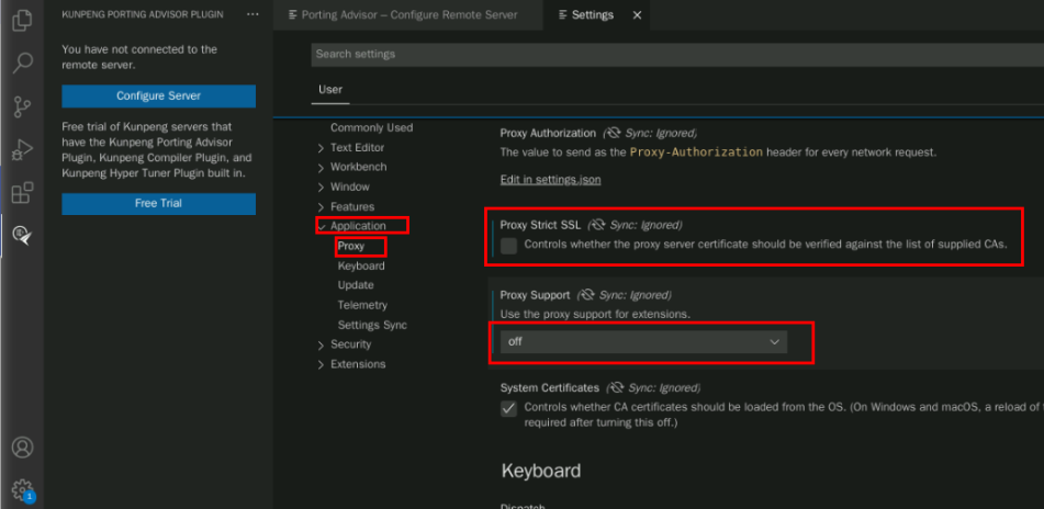 则需要手动修改VSCode的代理服务器,点击settings->Application->proxy“Proxy Strict SSL”选项不勾选,“Proxy Support”设置项,下拉框内选择“off”,然后再配置服务器页面重新点击保存即可,如下图所示: